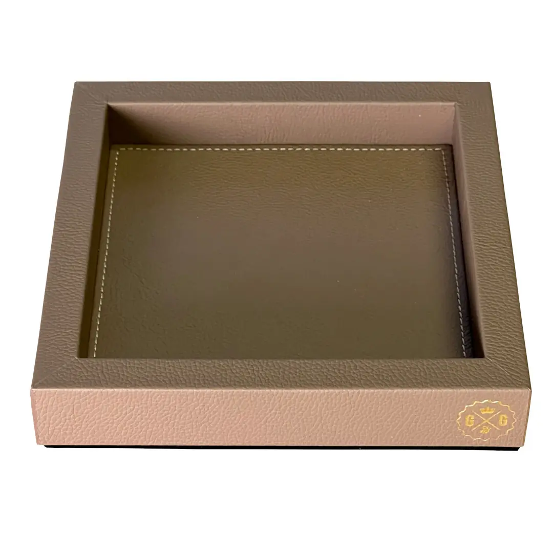 offers a range of square or Rectangular wooden pin trays, covered in premium grained leather, by hand, by our qualified leatherworkers. The underside of the pin tray is foamed and covered with a soft felt to protect the surface of your furniture and ensure good stability.