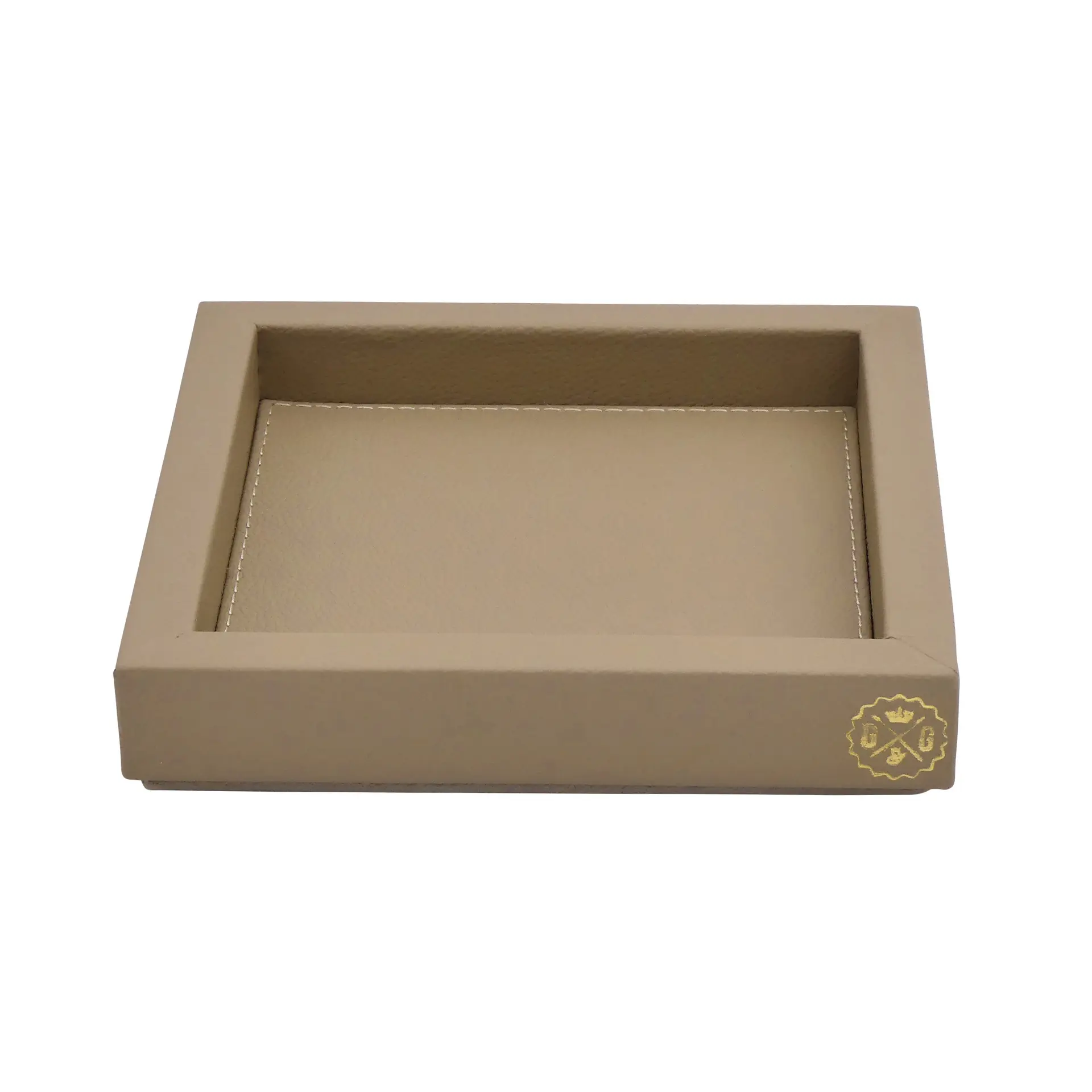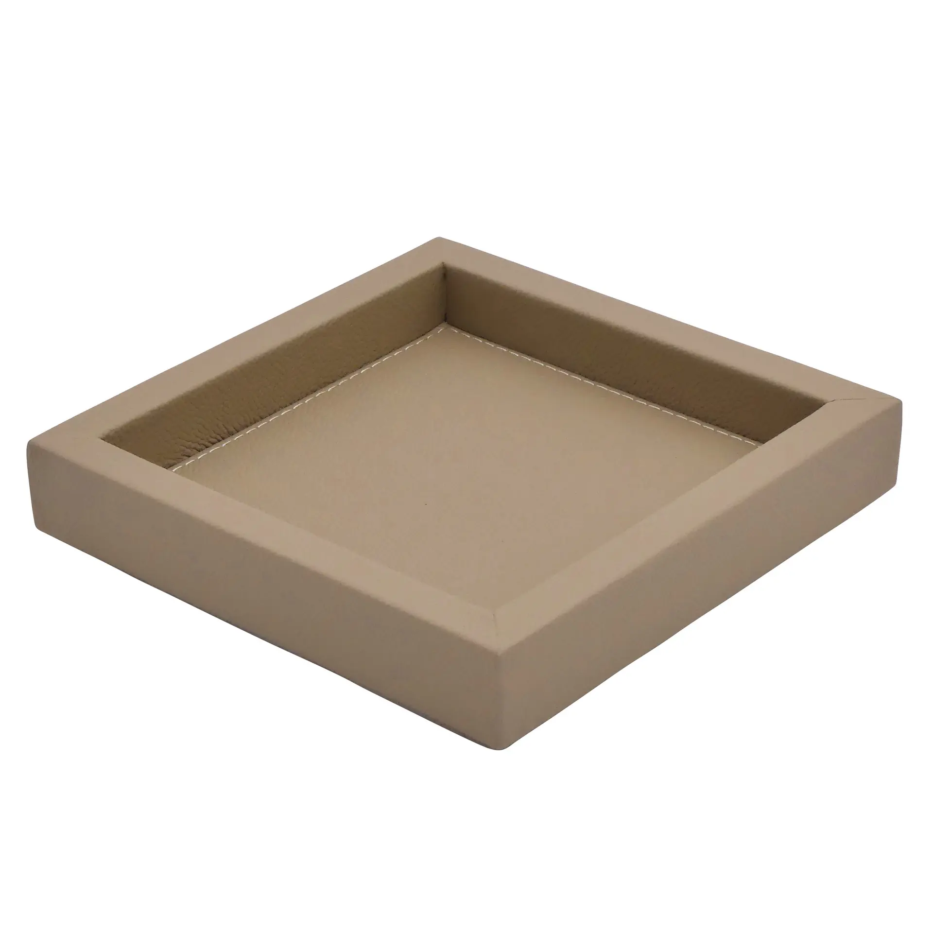 Elegant square pin tray covered in premium greige grained leather, handcrafted in France.