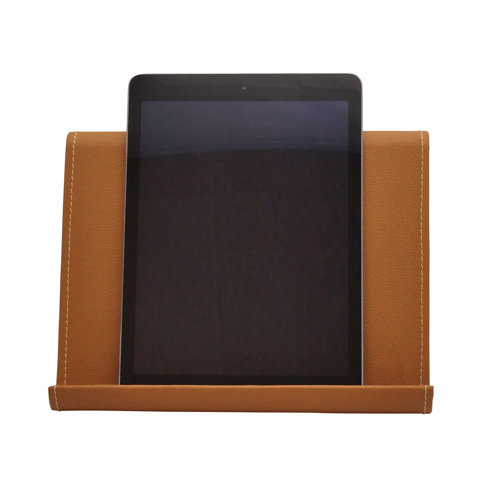 Elegant iPad holder in premium cinnamon leather, handmade in France for yachts and stylish interiors.