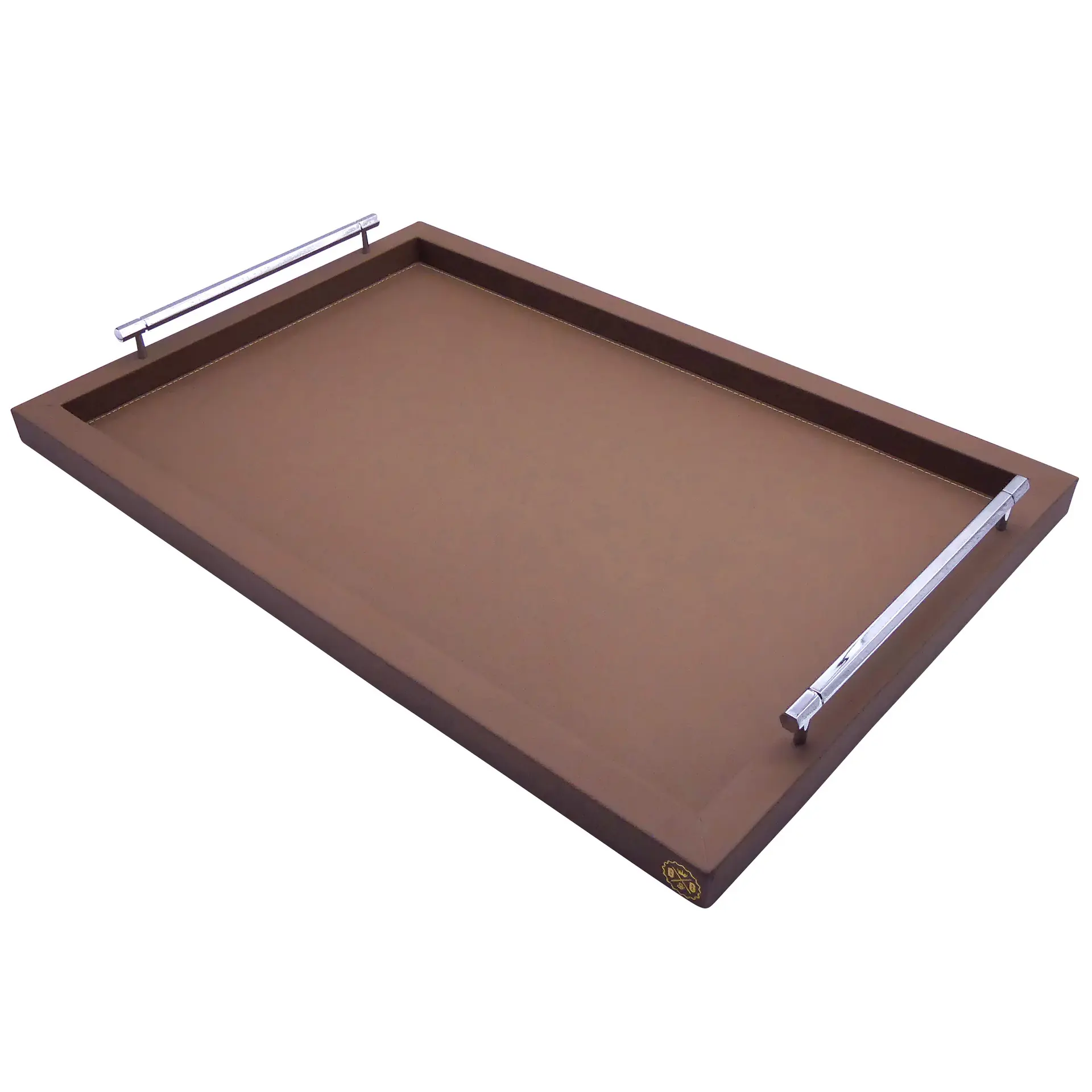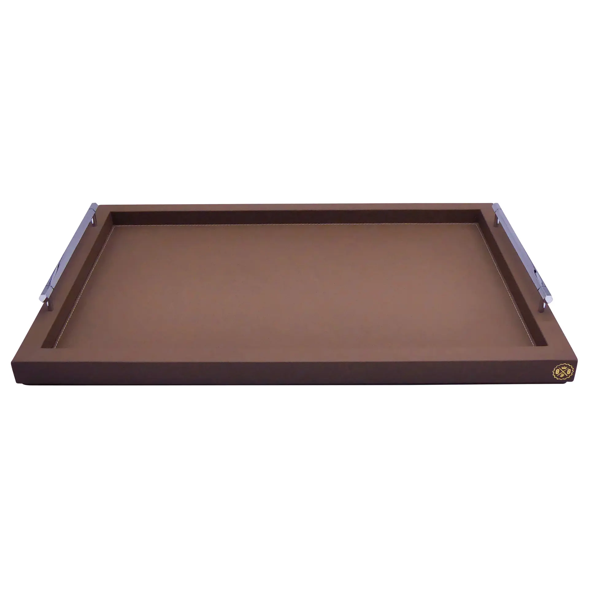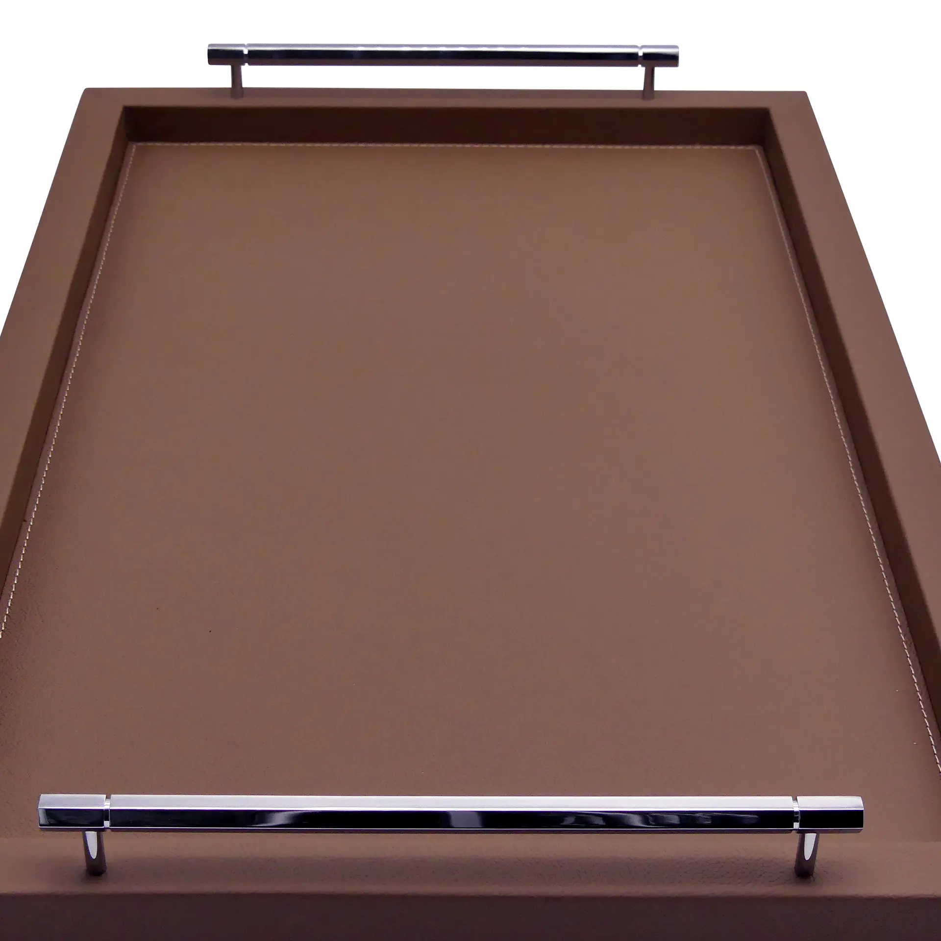 COLLECTION LOUIS offers a range of rectangular wooden trays, covered in premium grained leather, finished with solid brass handles with mirror chrome finish. Handcrafted by our qualified leatherworkers. The underside of the tray is foamed and covered with a soft felt to protect the surface of your furniture and ensure good stability. Made in france: