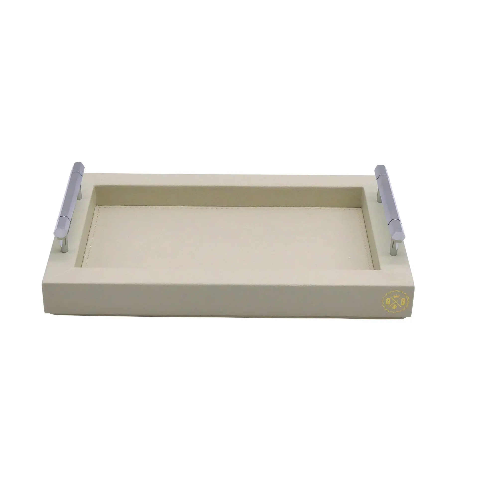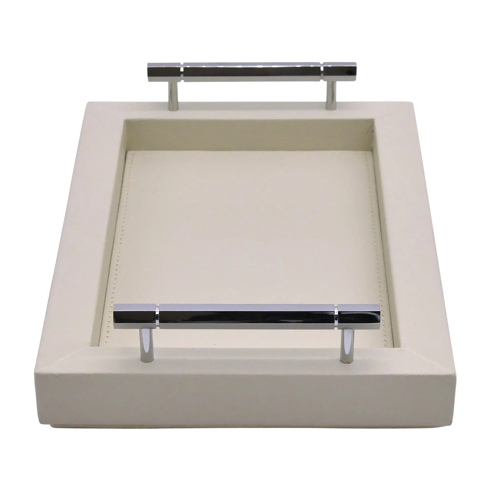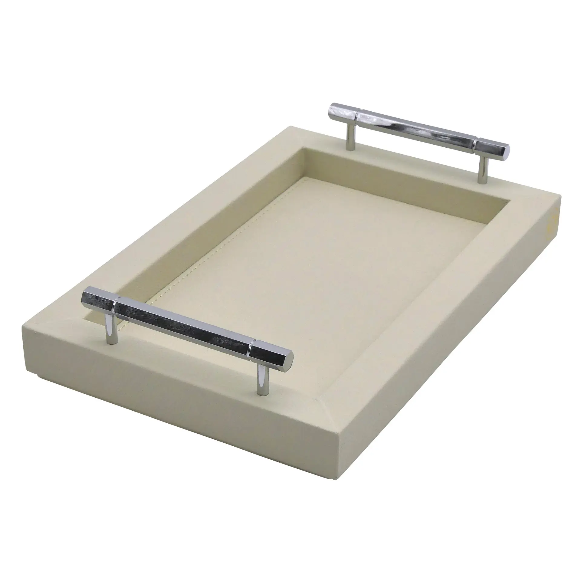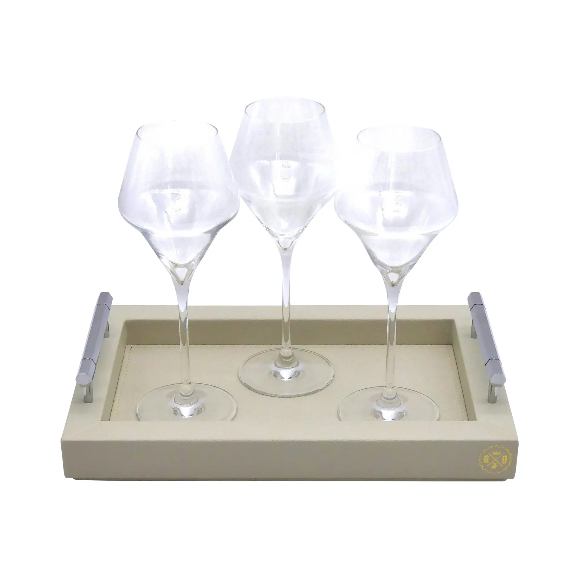 COLLECTION LOUIS offers a range of rectangular wooden trays, covered in premium grained leather, finished with solid brass handles with mirror chrome finish. Handcrafted by our qualified leatherworkers. The underside of the tray is foamed and covered with a soft felt to protect the surface of your furniture and ensure good stability. Made in france: