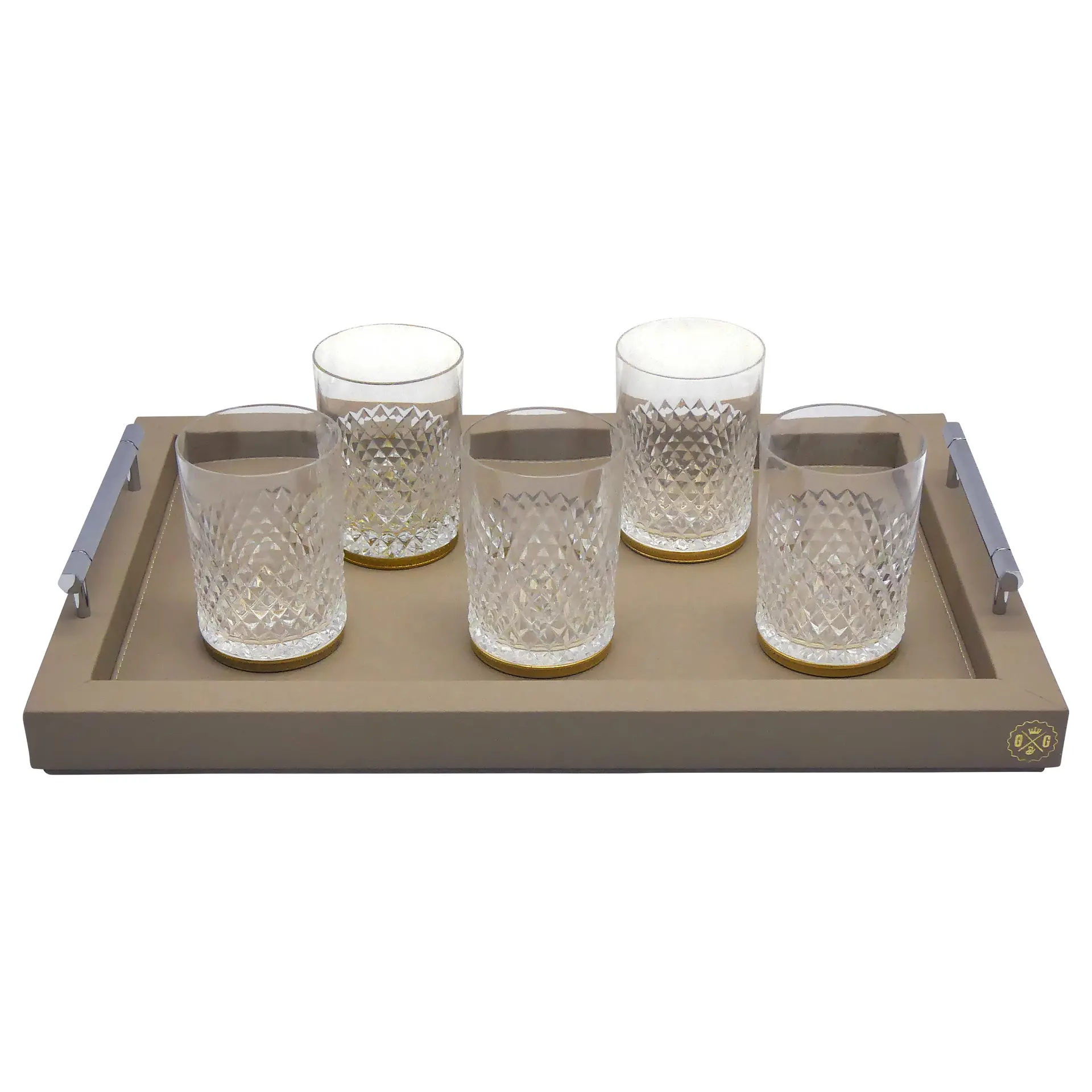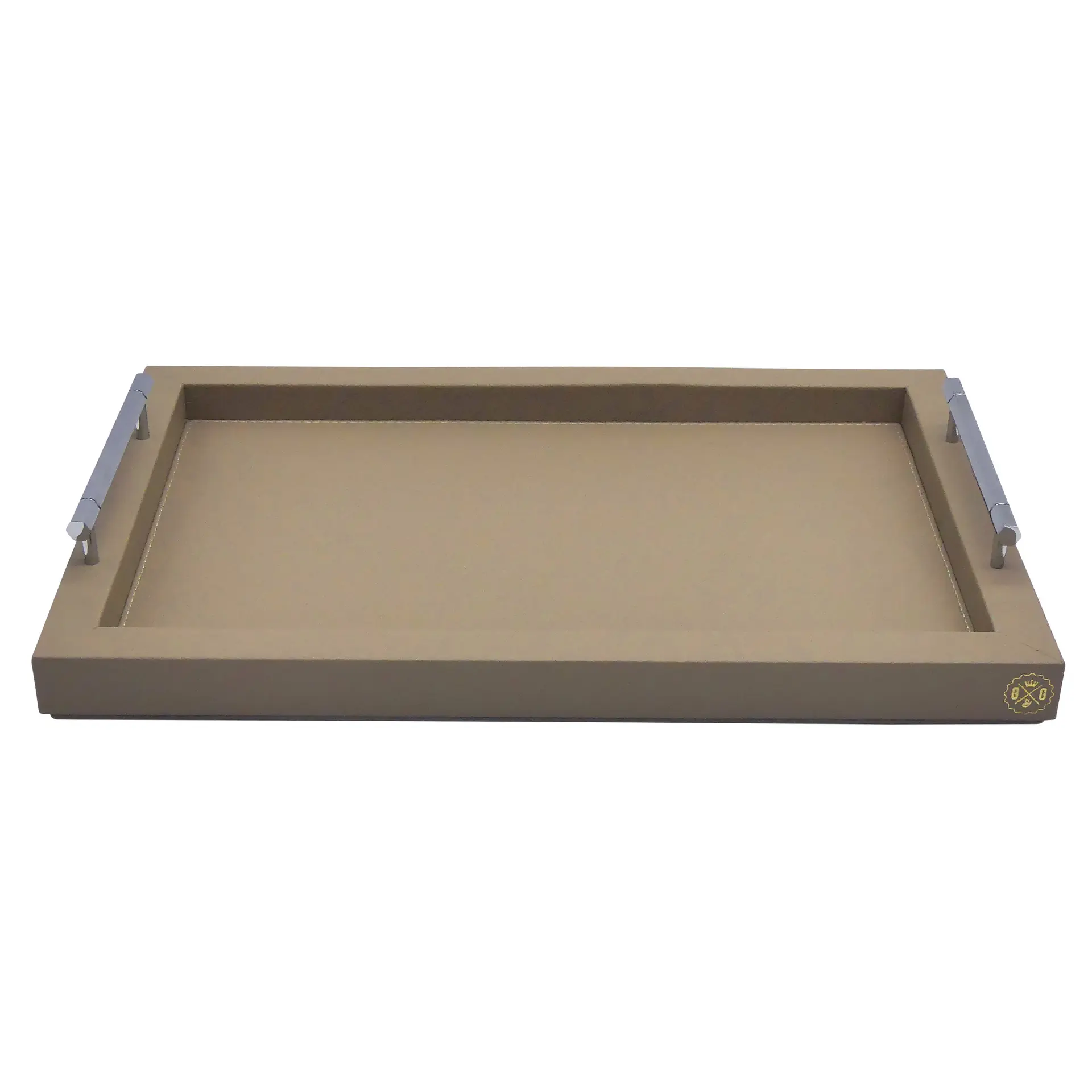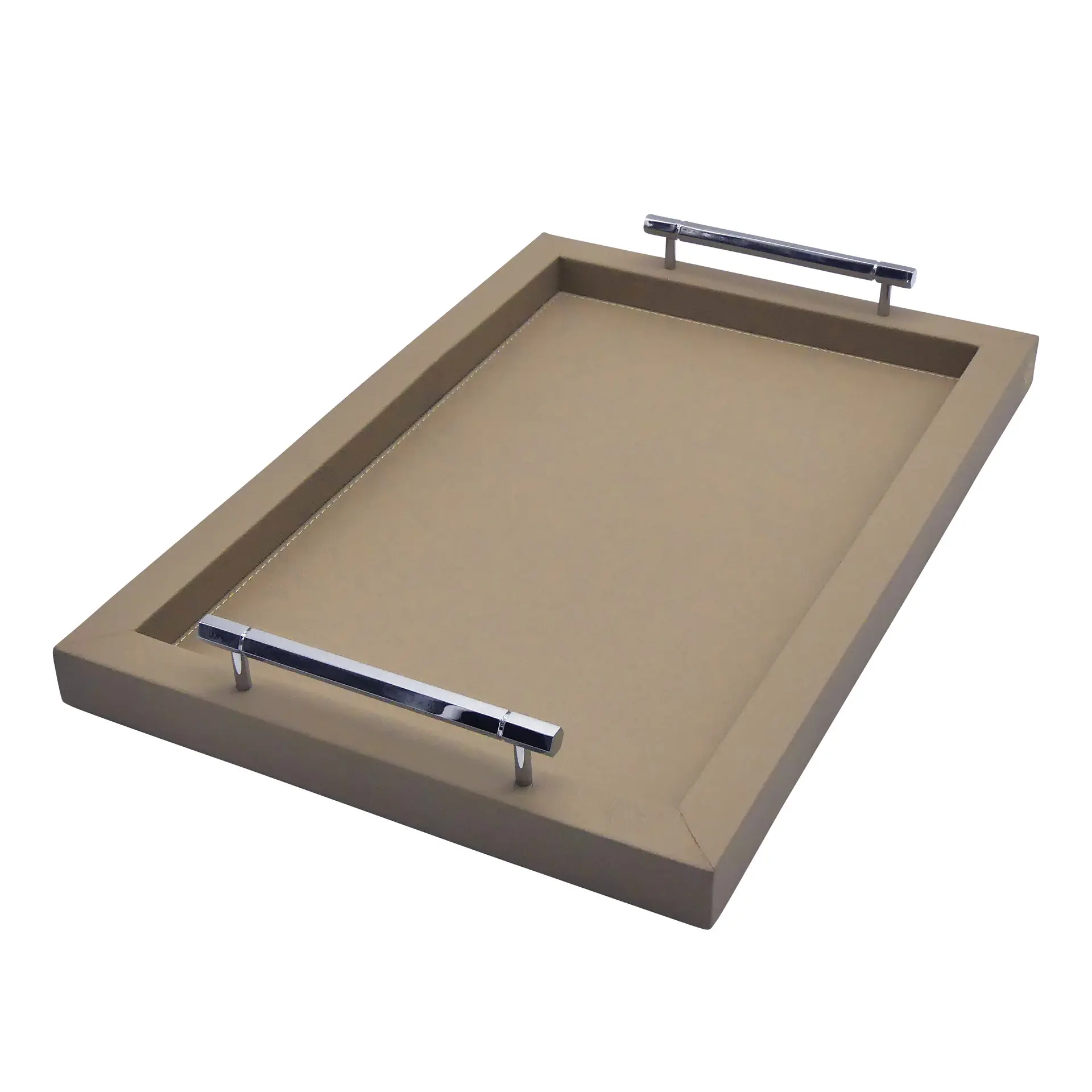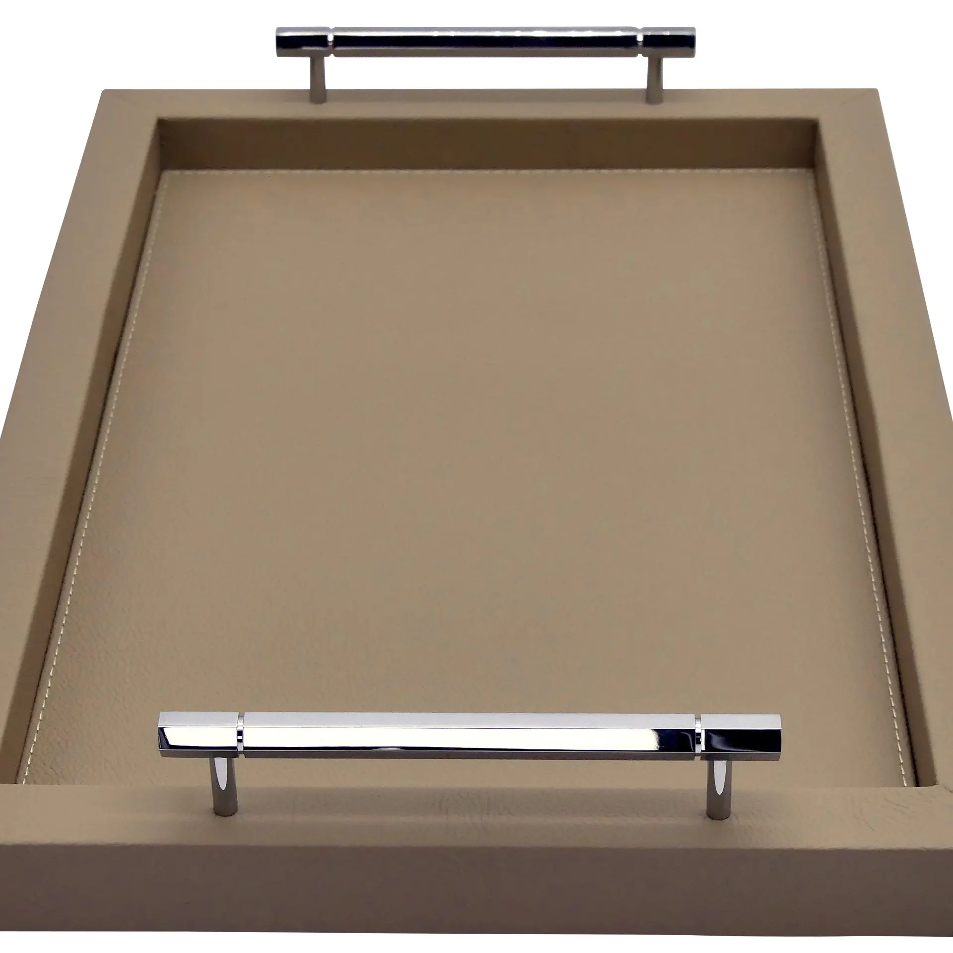 COLLECTION LOUIS offers a range of rectangular wooden trays, covered in premium grained leather, finished with solid brass handles with mirror chrome finish. Handcrafted by our qualified leatherworkers. The underside of the tray is foamed and covered with a soft felt to protect the surface of your furniture and ensure good stability. Made in france :