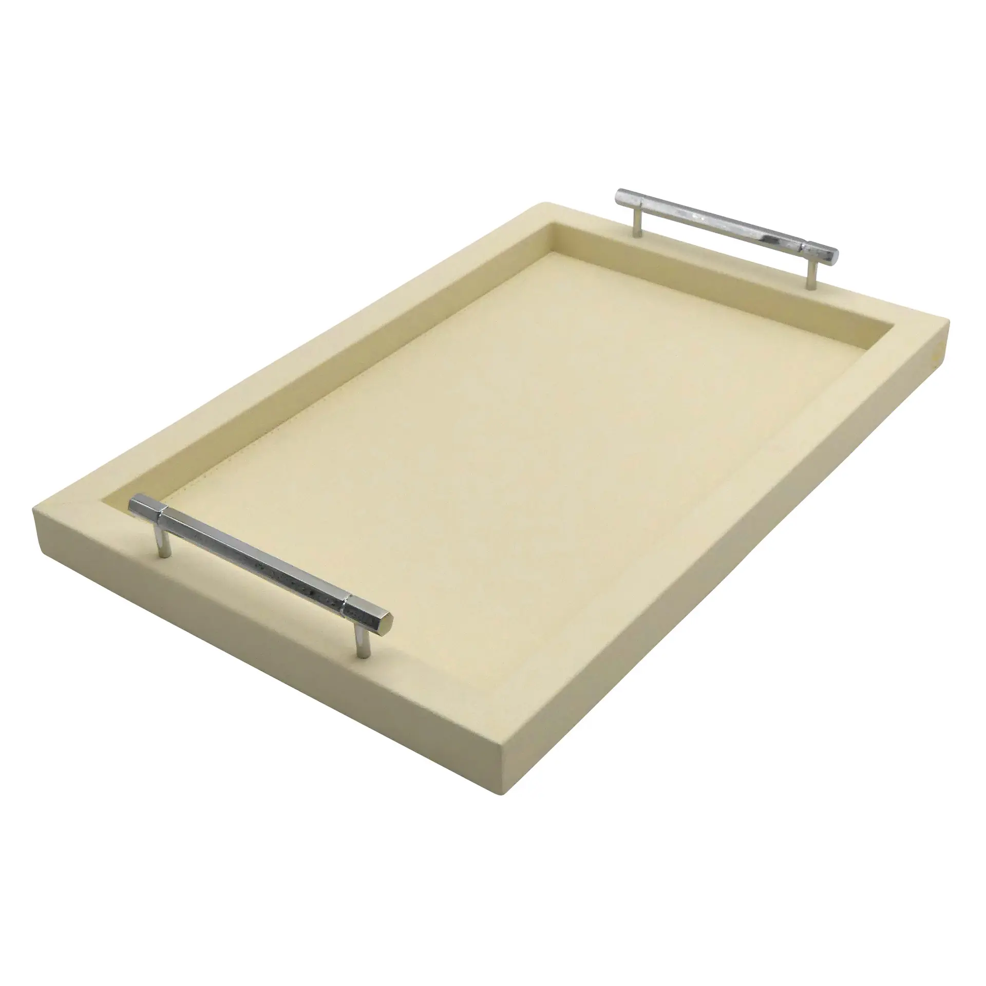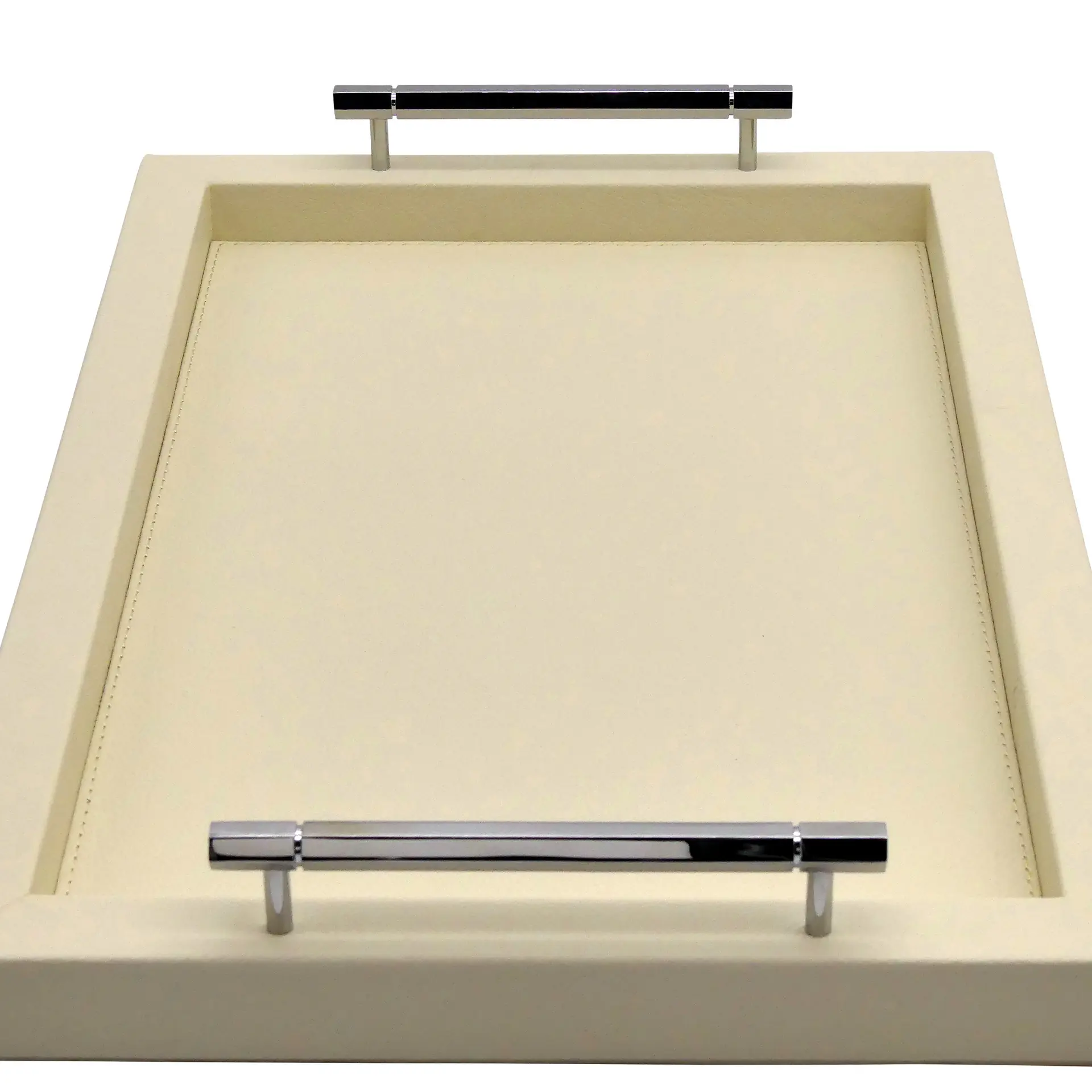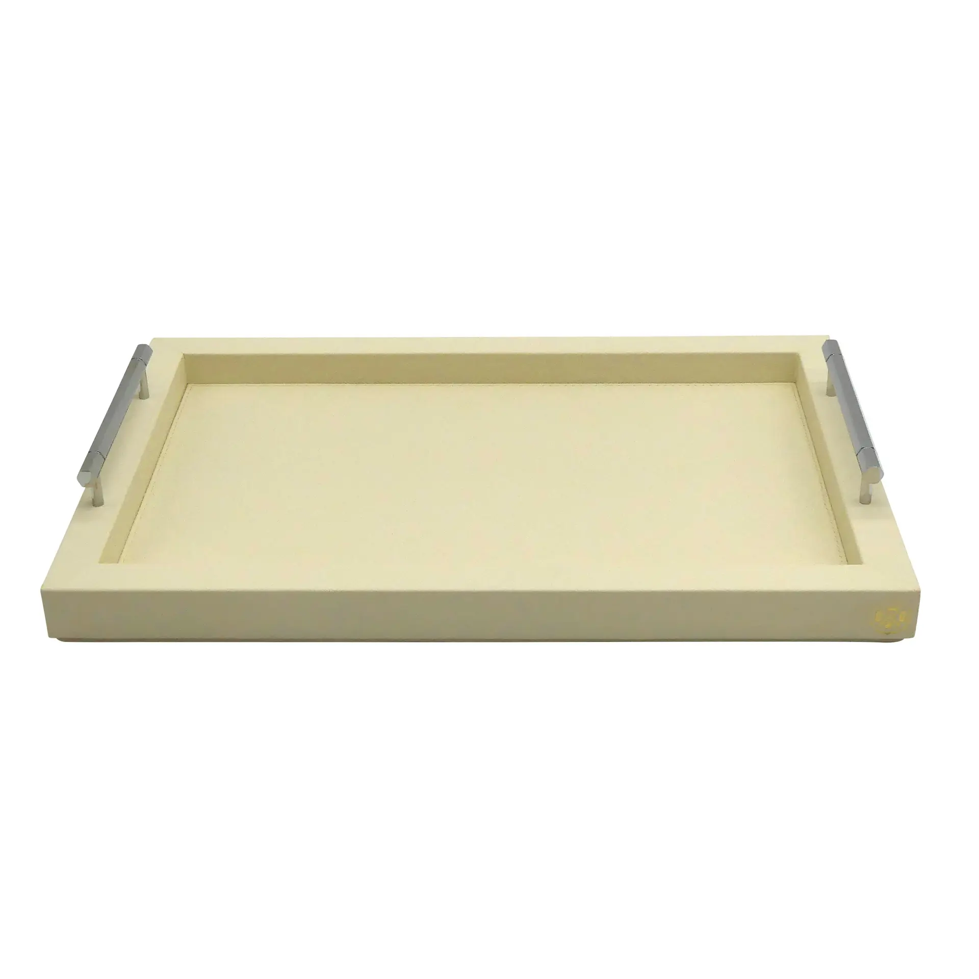 COLLECTION LOUIS offers a range of rectangular wooden trays, covered in premium grained leather, finished with solid brass handles with mirror chrome finish. Handcrafted by our qualified leatherworkers. The underside of the tray is foamed and covered with a soft felt to protect the surface of your furniture and ensure good stability. Made in france: