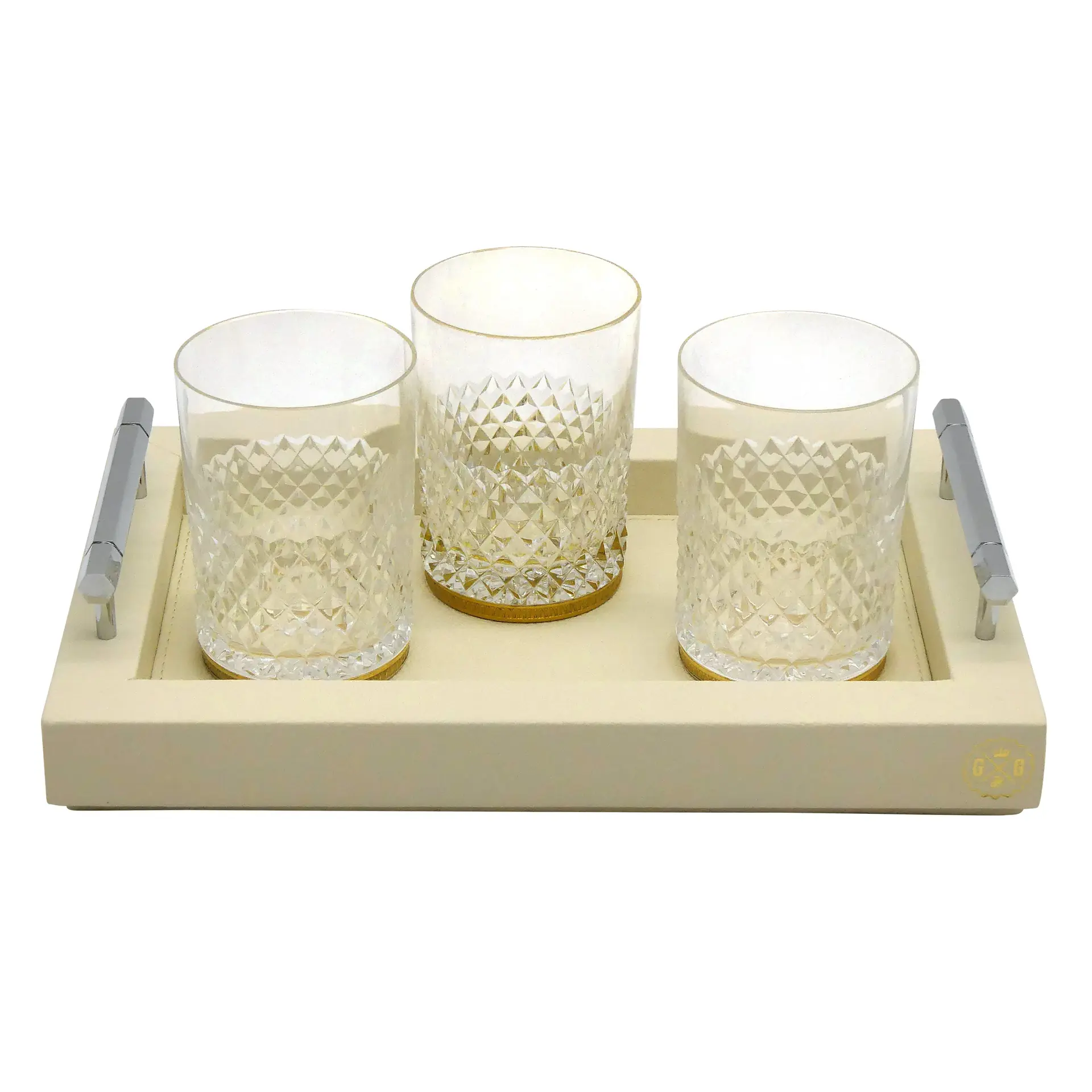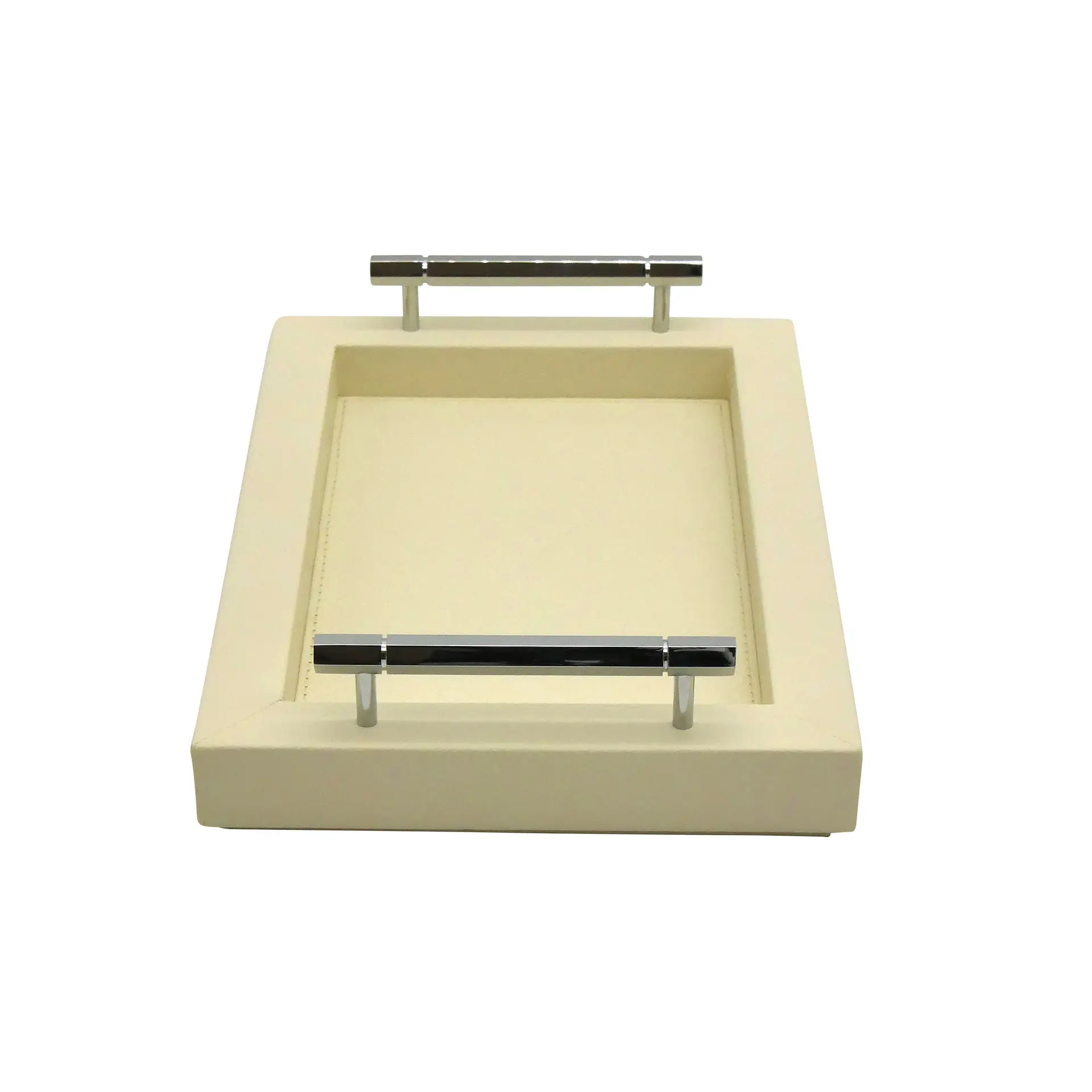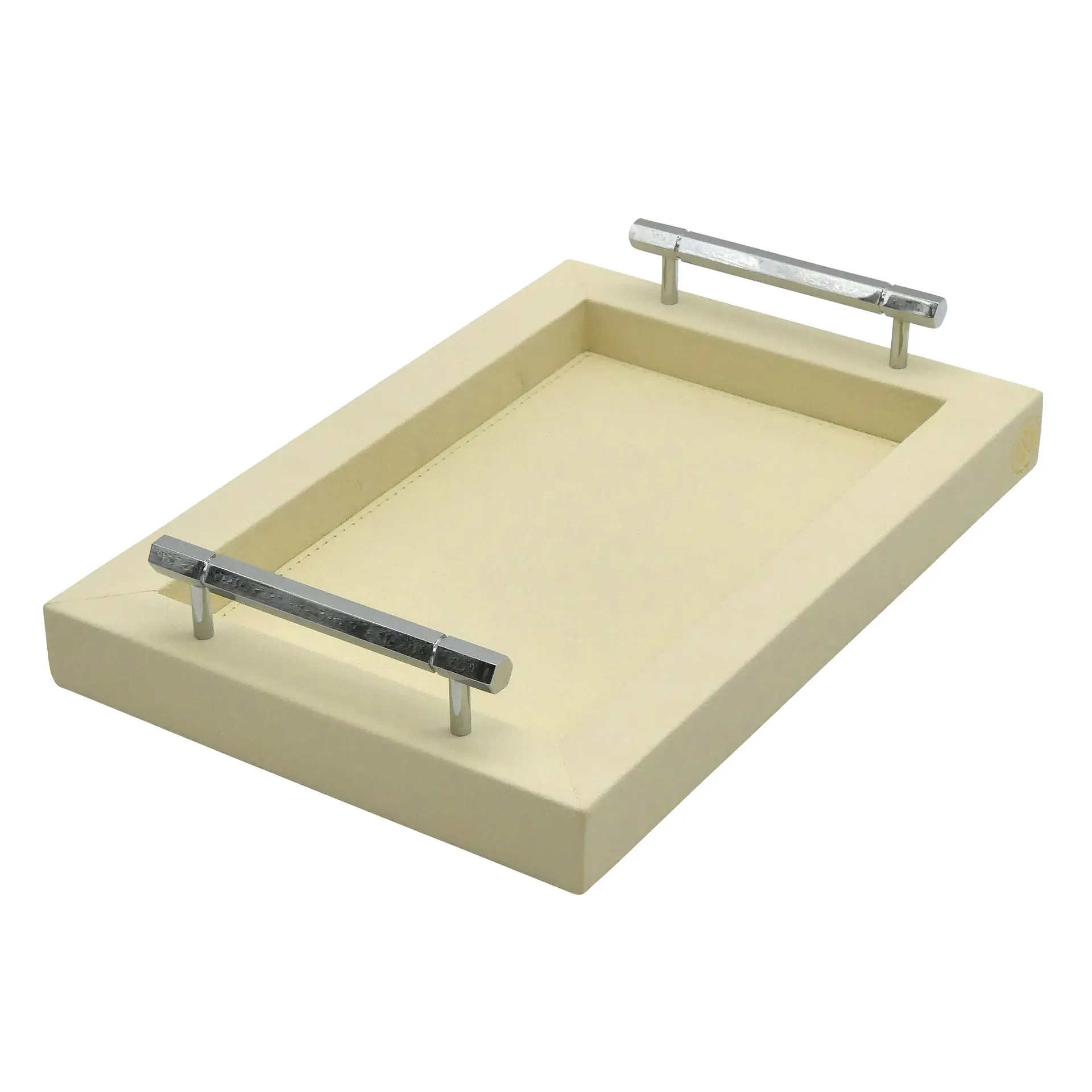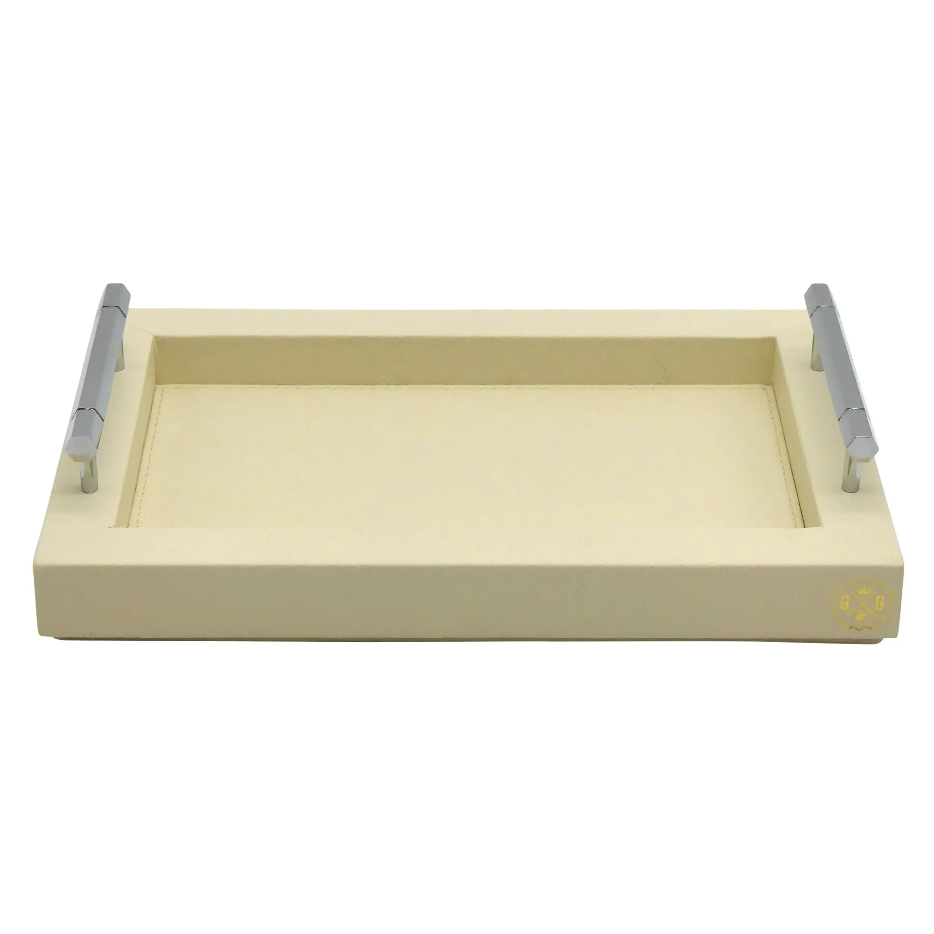 COLLECTION LOUIS offers a range of rectangular wooden trays, covered in premium grained leather, finished with solid brass handles with mirror chrome finish. Handcrafted by our qualified leatherworkers. The underside of the tray is foamed and covered with a soft felt to protect the surface of your furniture and ensure good stability. Made in france :