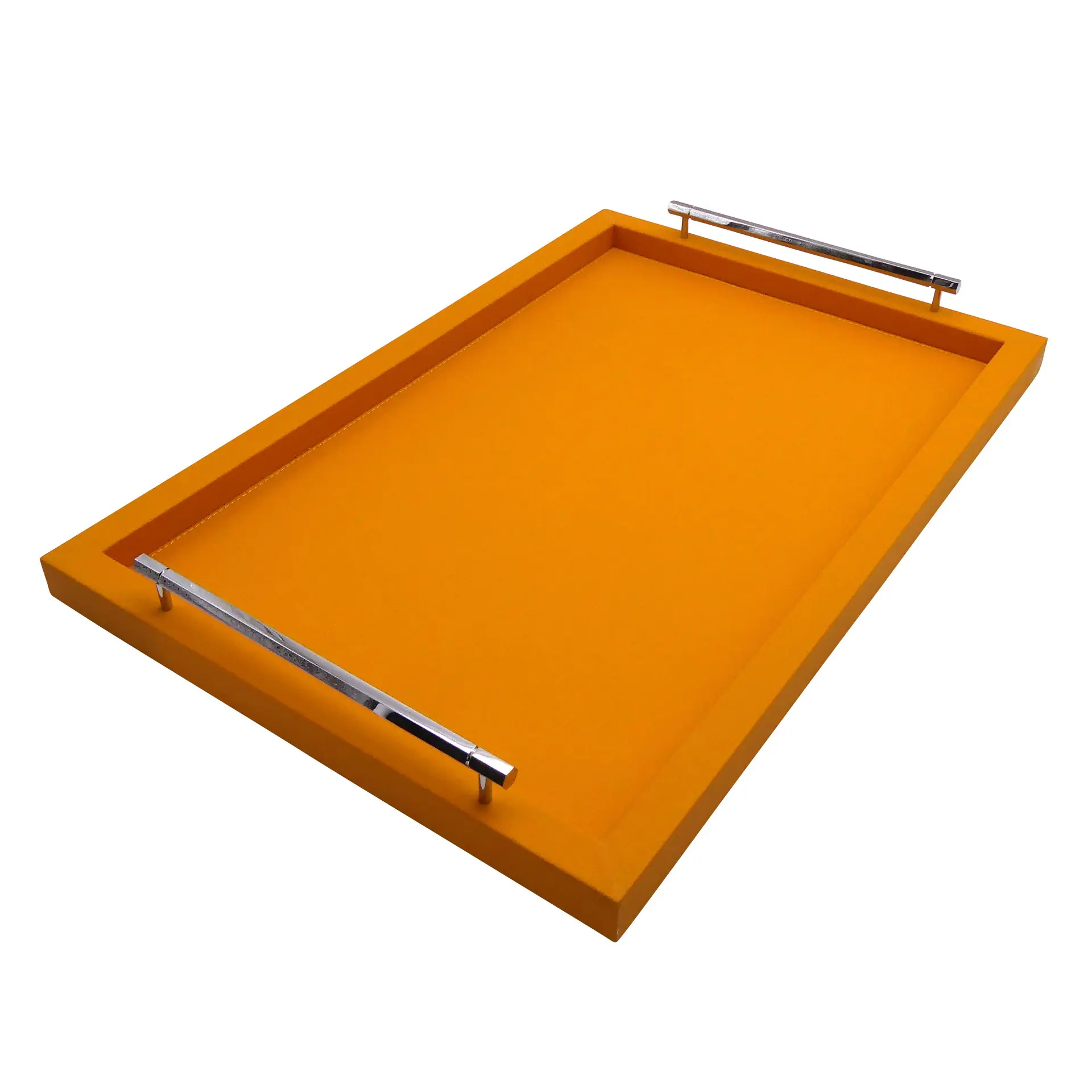 COLLECTION LOUIS offers a range of rectangular wooden trays, covered in premium grained leather, finished with solid brass handles with mirror chrome finish. Handcrafted by our qualified leatherworkers. The underside of the tray is foamed and covered with a soft felt to protect the surface of your furniture and ensure good stability. Made in france: