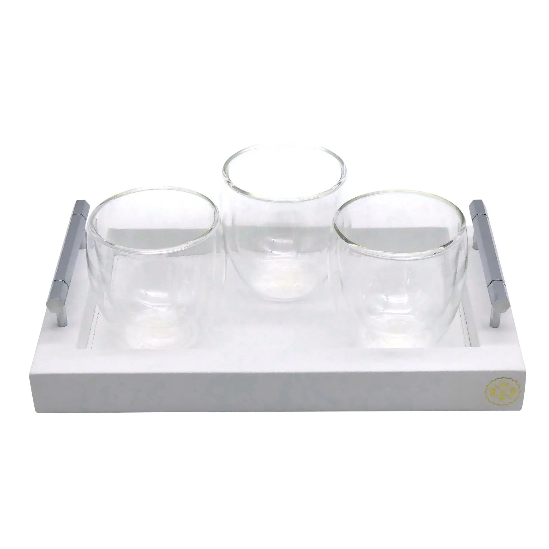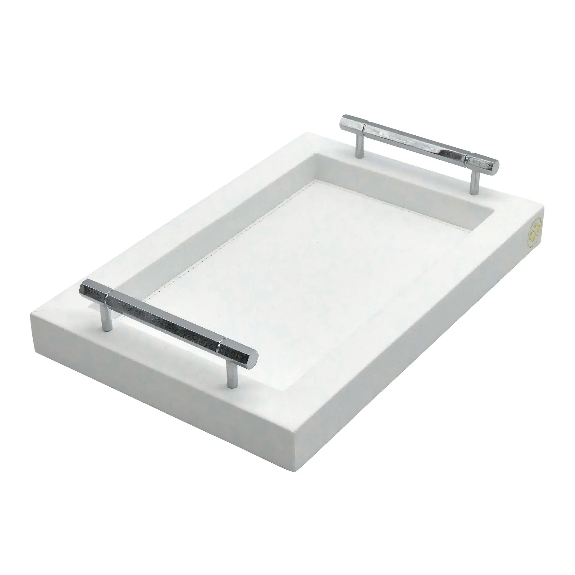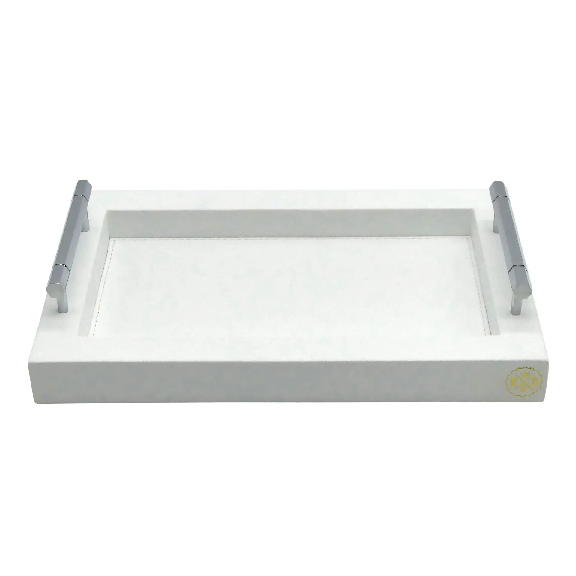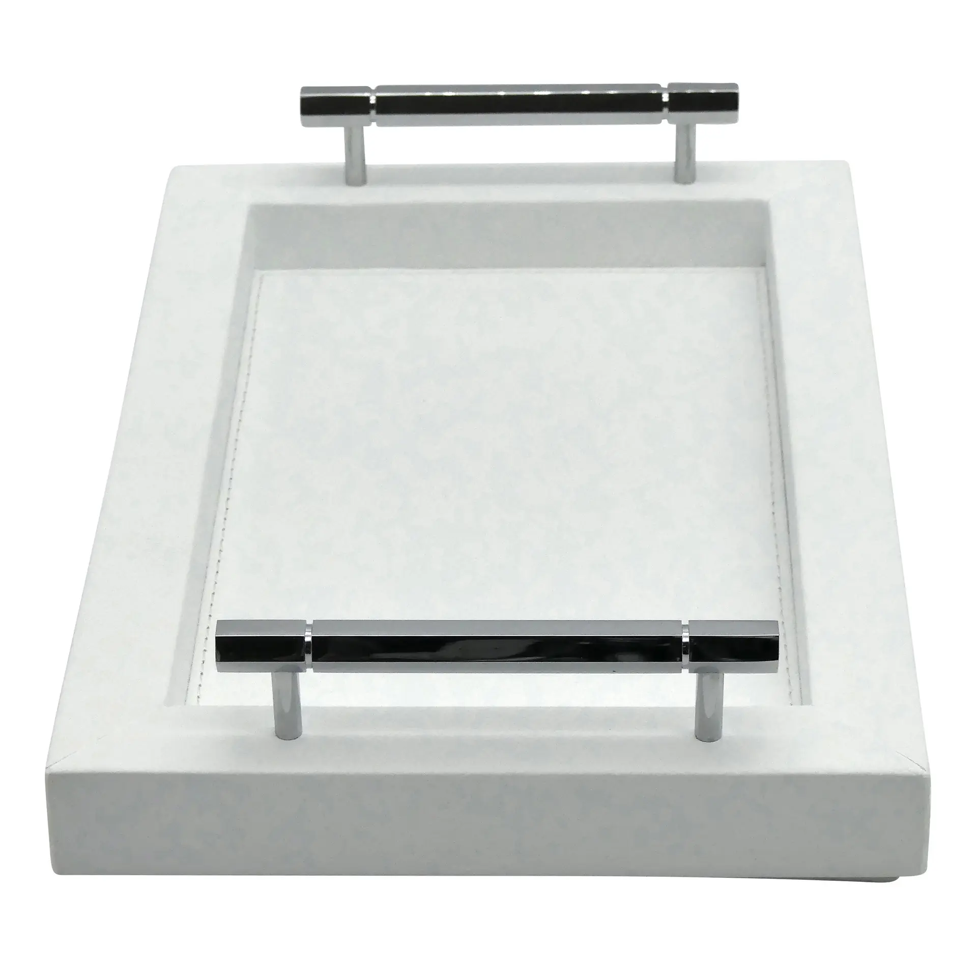 Elegant rectangular tray covered in white grained leather with chrome handles, perfect for stylish home decor.