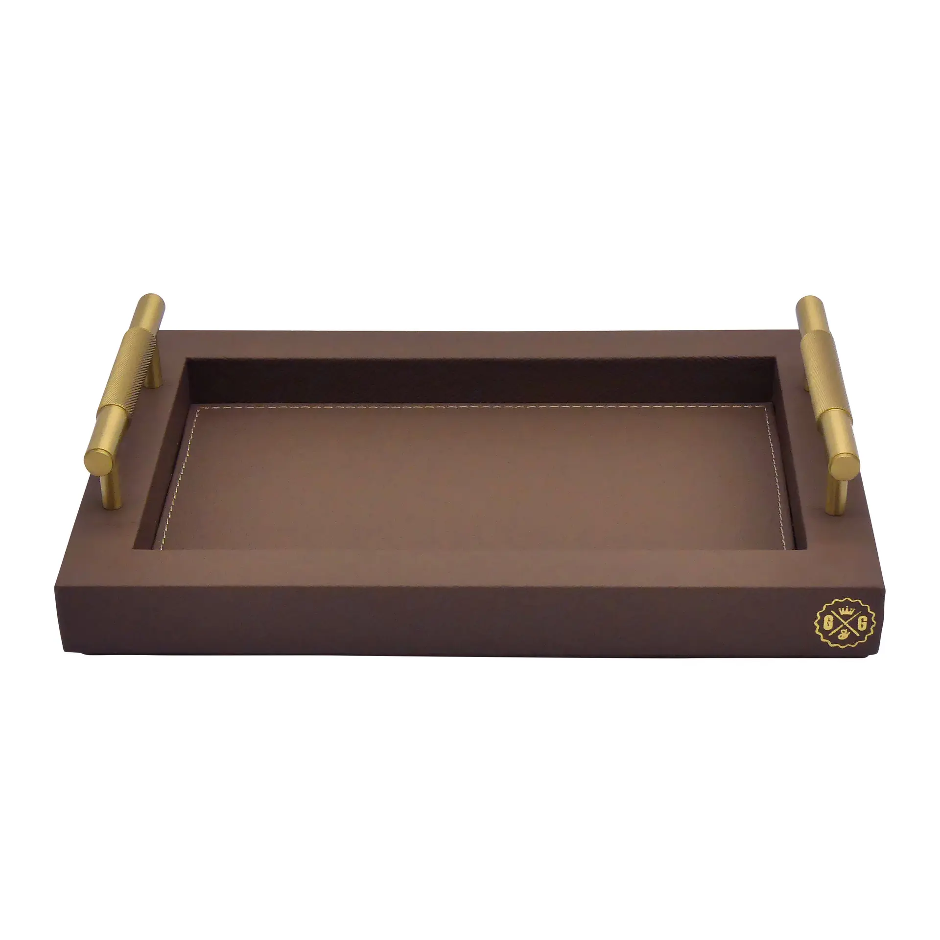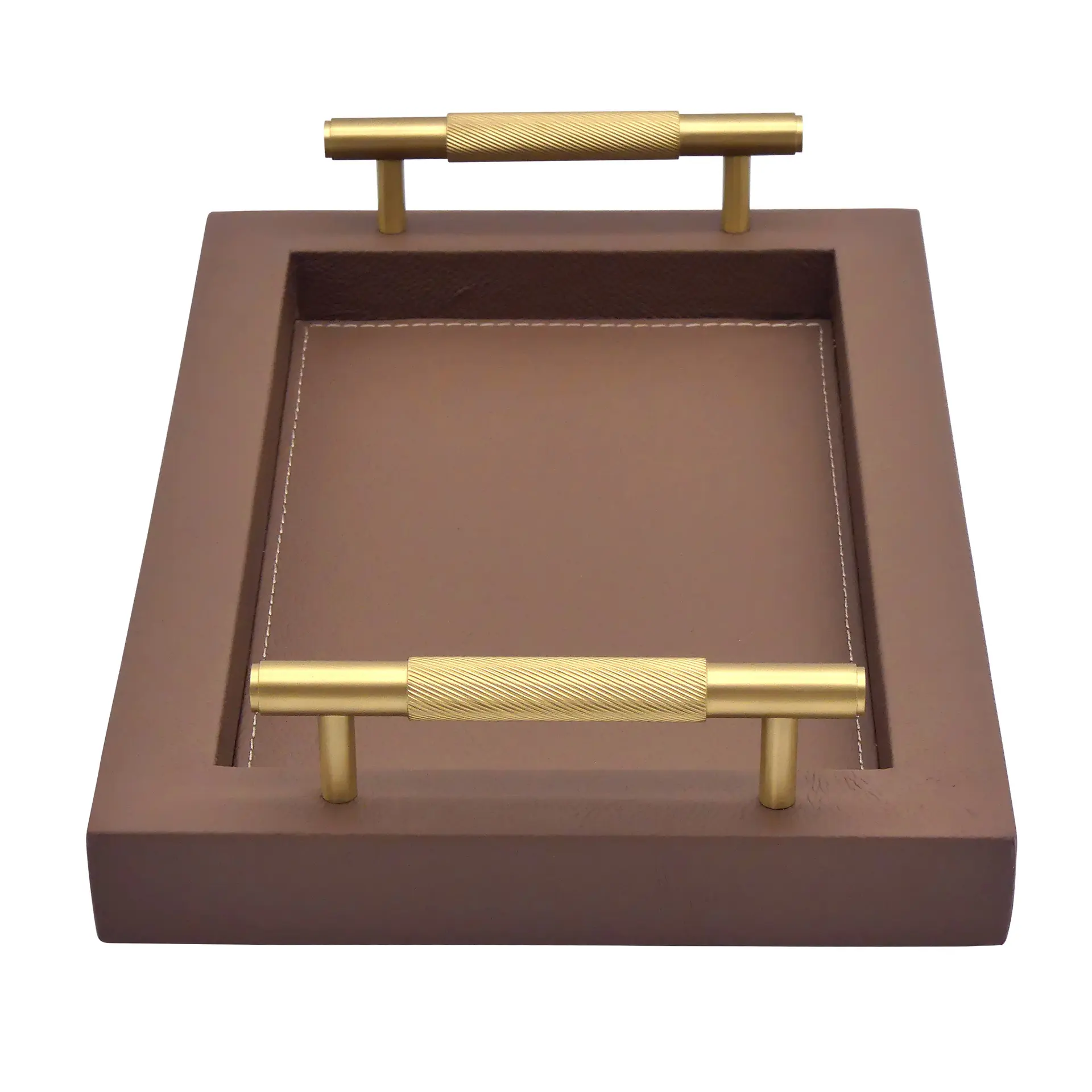 offers a range of rectangular wooden trays, covered in premium grained leather, finished with ribbed golden brass handles. Handcrafted by our qualified leatherworkers. The underside of the tray is foamed and covered with a soft felt to protect the surface of your furniture and ensure good stability. Made in France: