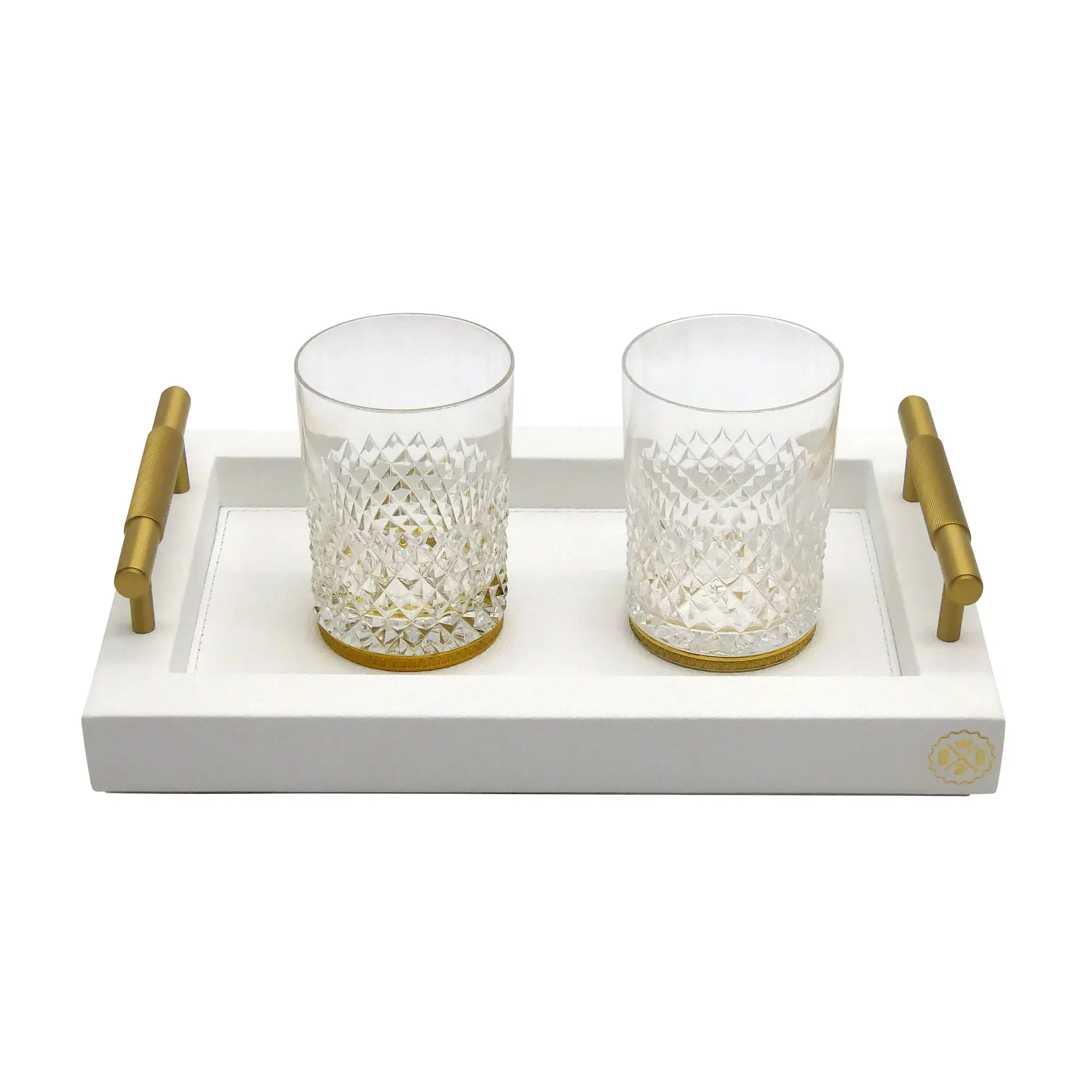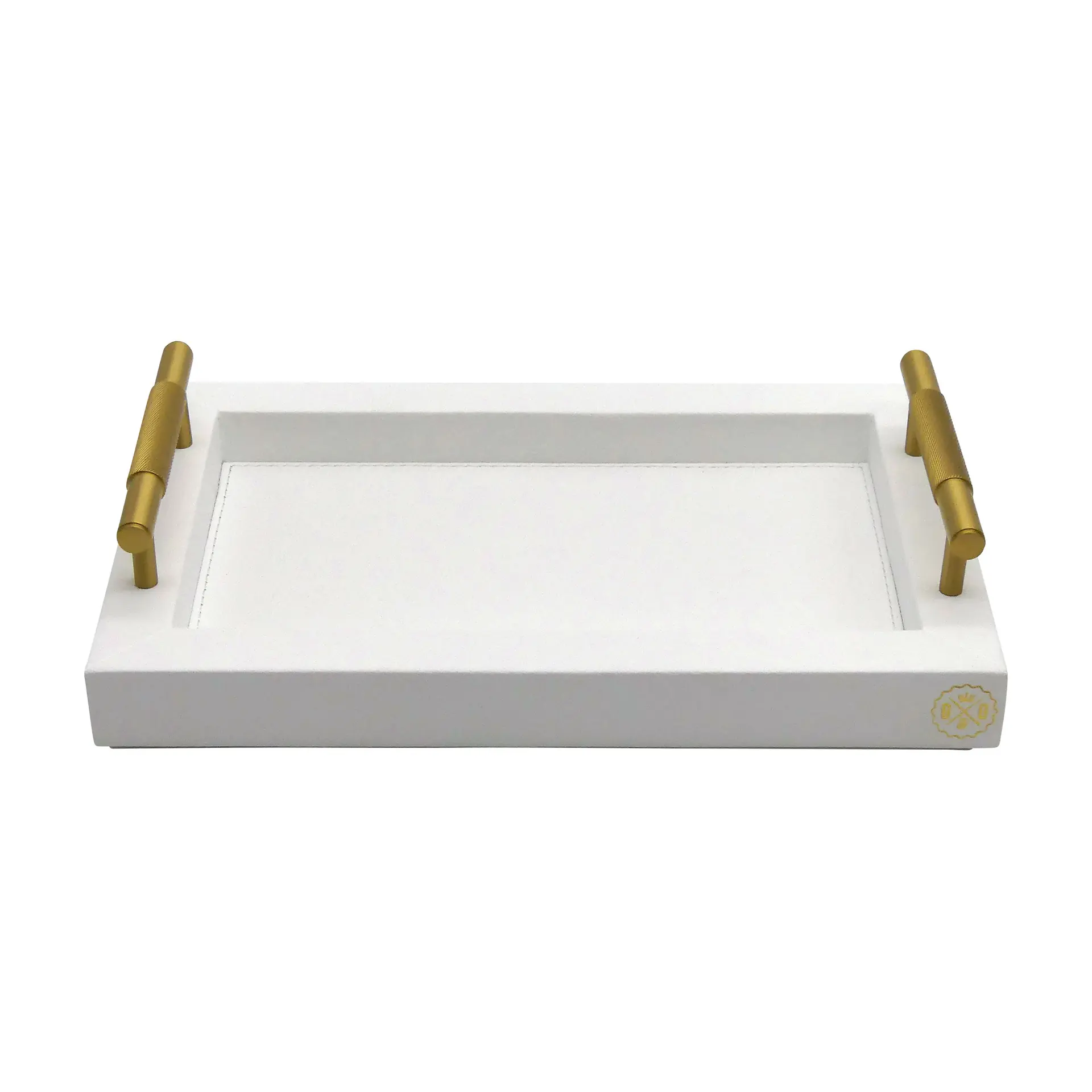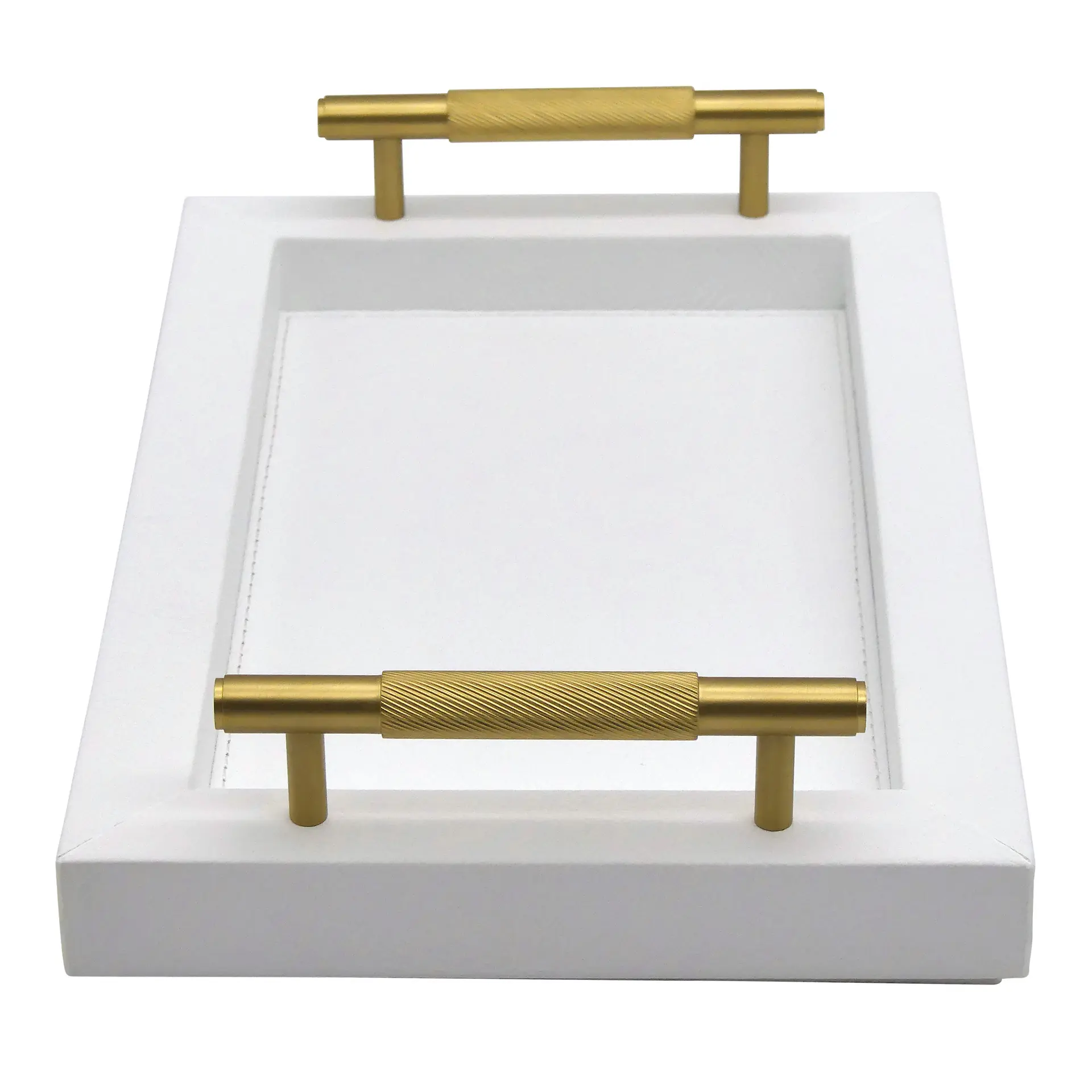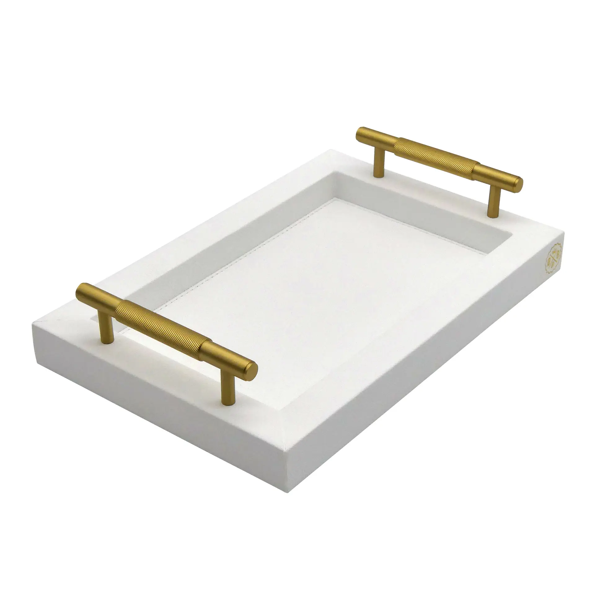offers a range of rectangular wooden trays, covered in premium grained leather, finished with ribbed golden brass handles. Handcrafted by our qualified leatherworkers. The underside of the tray is foamed and covered with a soft felt to protect the surface of your furniture and ensure good stability. Made in France: