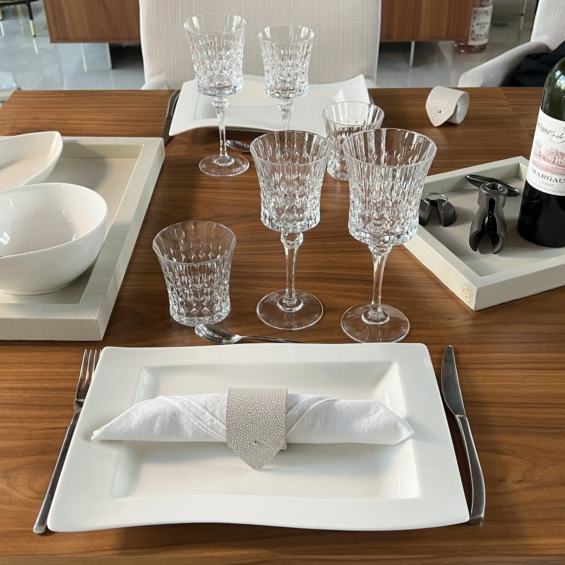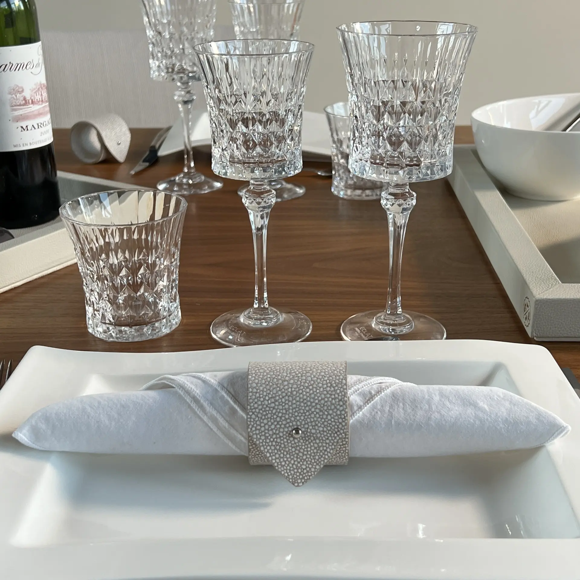 Bring a jewel to your table with this napkin ring, sold in sets of 2, entirely in premium leather. The napkin ring closes with a stainless steel button, specially designed for Yachting. A thin and elegant bracelet to strap your napkins. Made in France by our qualified leather workers.