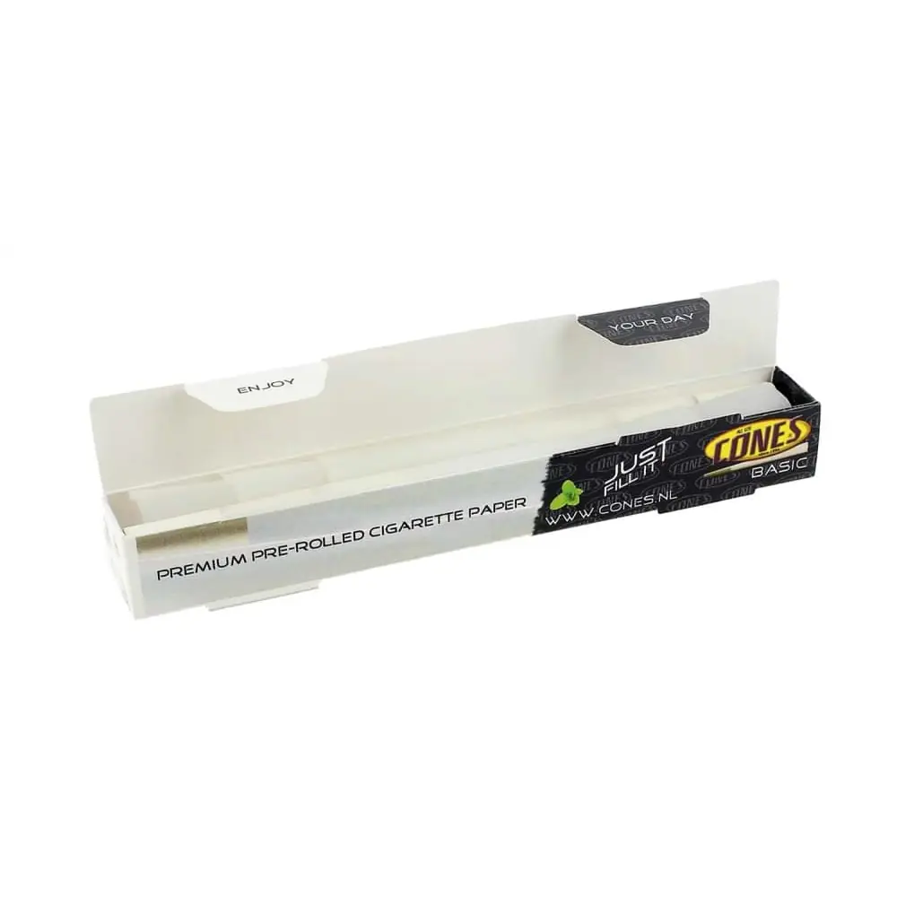 basic king size cones x 12. 12 basic king size cones pre rolled in good quality fine rolling paper and cardboard filter rolled in w. comes in a cardboard box which will protect them during transport.
