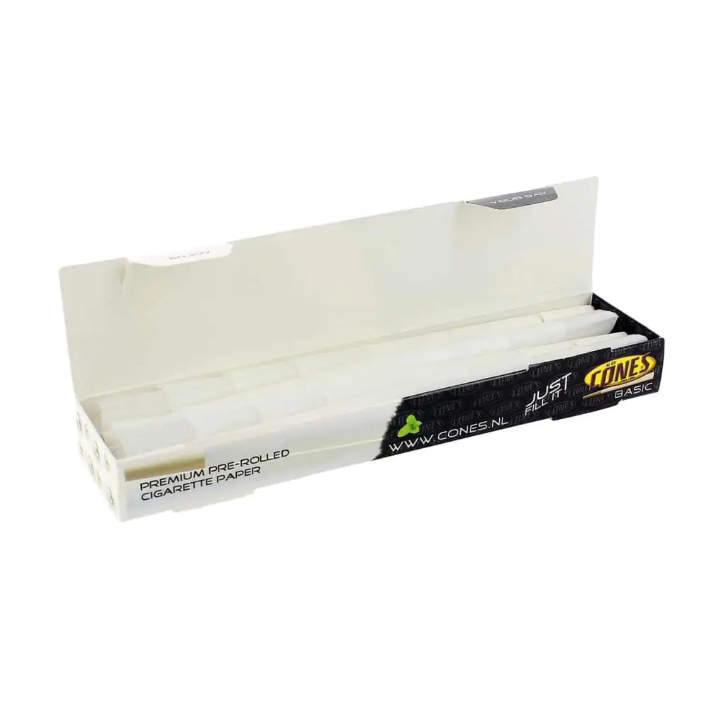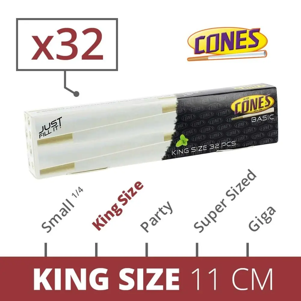 basic king size cones x 32. 32 basic king size cones pre-rolled in good quality fine rolling paper and cardboard filter rolled in w. supplied in a cardboard box which will protect them during transport.