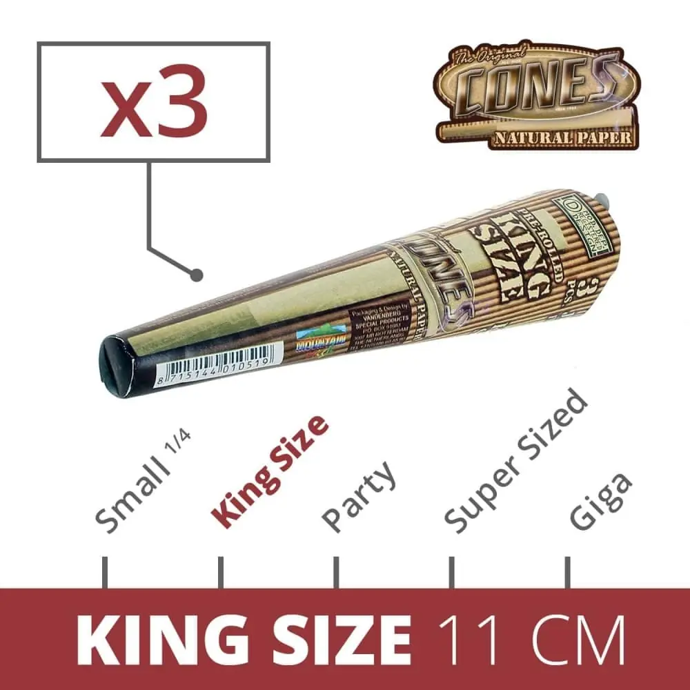 king size cones unbleached x 3. 3 king size cones pre rolled in fine unbleached rolling paper and cardboard filter rolled in w. comes in a cardboard case that will protect them during transport.