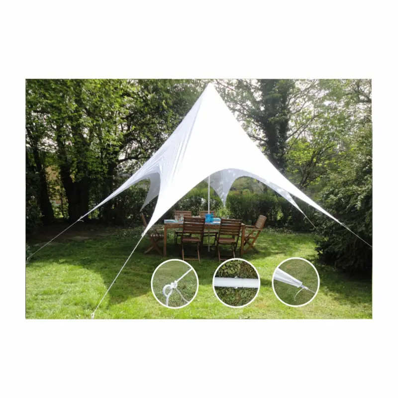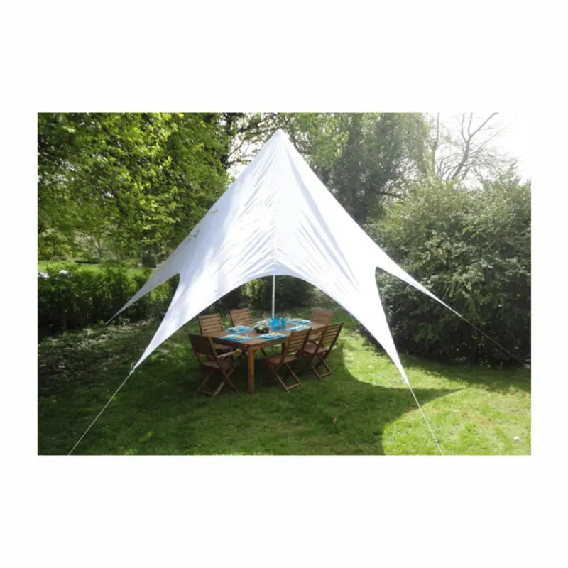 With thisTepee Sun Canopy you can enjoy your garden or terrace peacefully without worrying about getting sunburned. Your family meals will be much more enjoyable for everyone's comfort! Moreover, this pyramid tipi canopy adds an original decorative touch to your outdoor space. It is easy to set up with ropes and pegs, saving you the hassle of installing a freestanding parasol. Another great advantage of this 3.5m diameter canopy is that it is waterproof: no stains, this moisture-resistant canopy is resistant to dirt and bad weather. Delivered with a carrying bag. Enjoy a shaded space in complete conviviality!