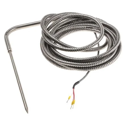 Pt100 straight or angled fixing probes. Temperature probes with 1 or 2 Pt 100, Class B. 316 stainless steel straight or angled handle. 3-metre PTFE / PTFE connectioncable. Output protected by stainless steel hose.