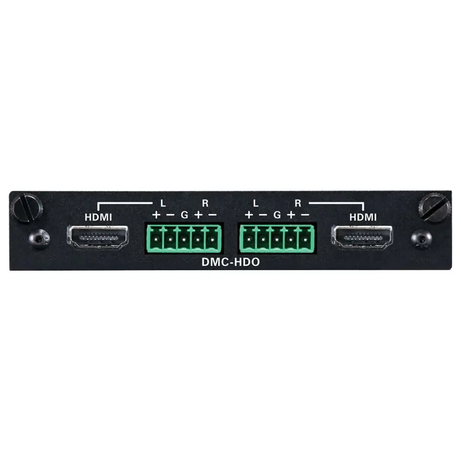 A modular output card for DM-MD8X8, DM-MD16X16, or DM-MD32X32 switchers. Provides two independent HDMI® outputs, each with a complementary balanced analog audio output.