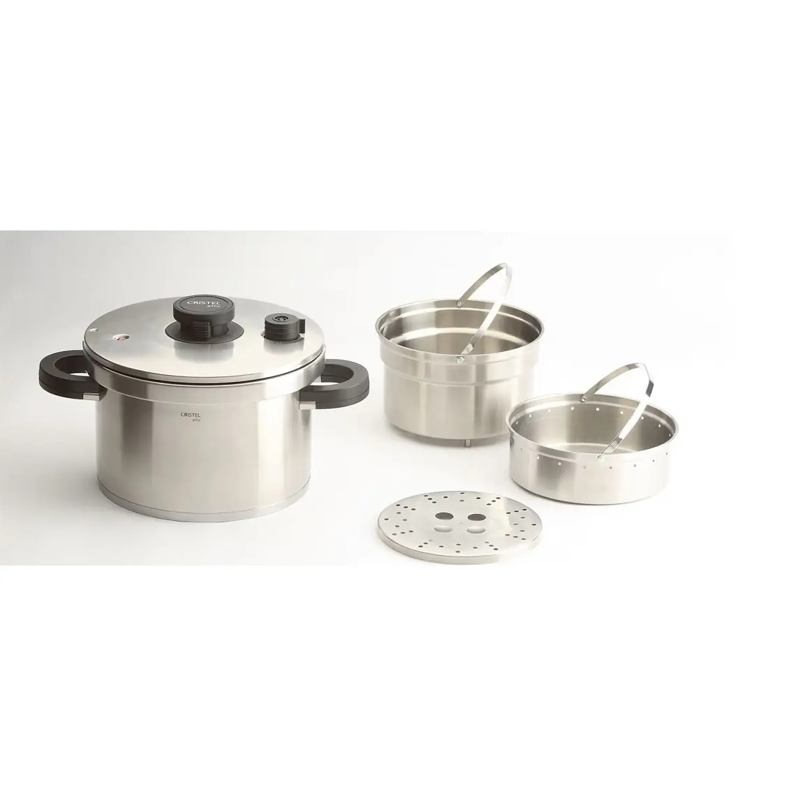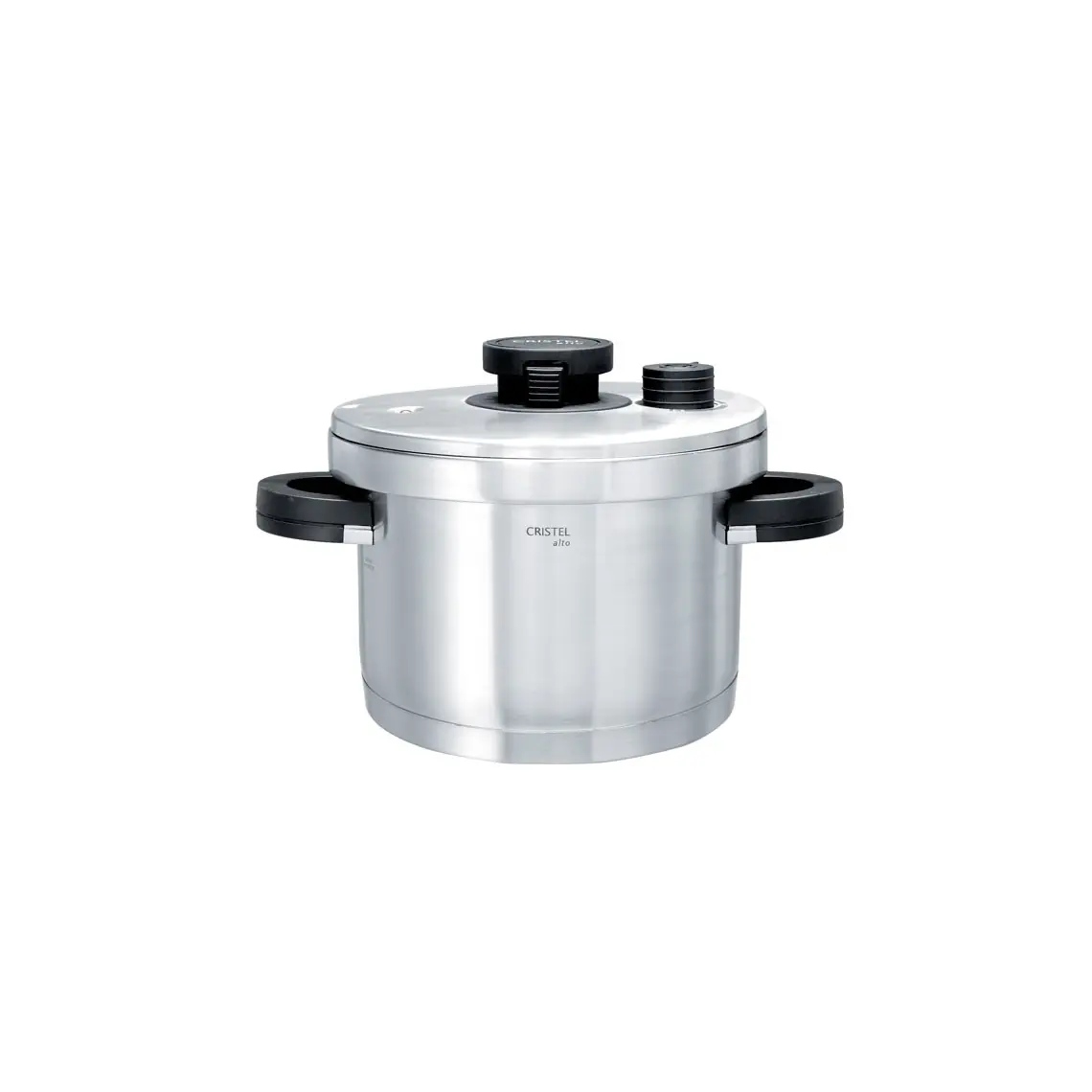 Pressure cooker made of 18/10 brushed stainless steel, effortless opening and closing with one hand, no need to turn the lid, protected seal. Compatible with all heat sources including induction.