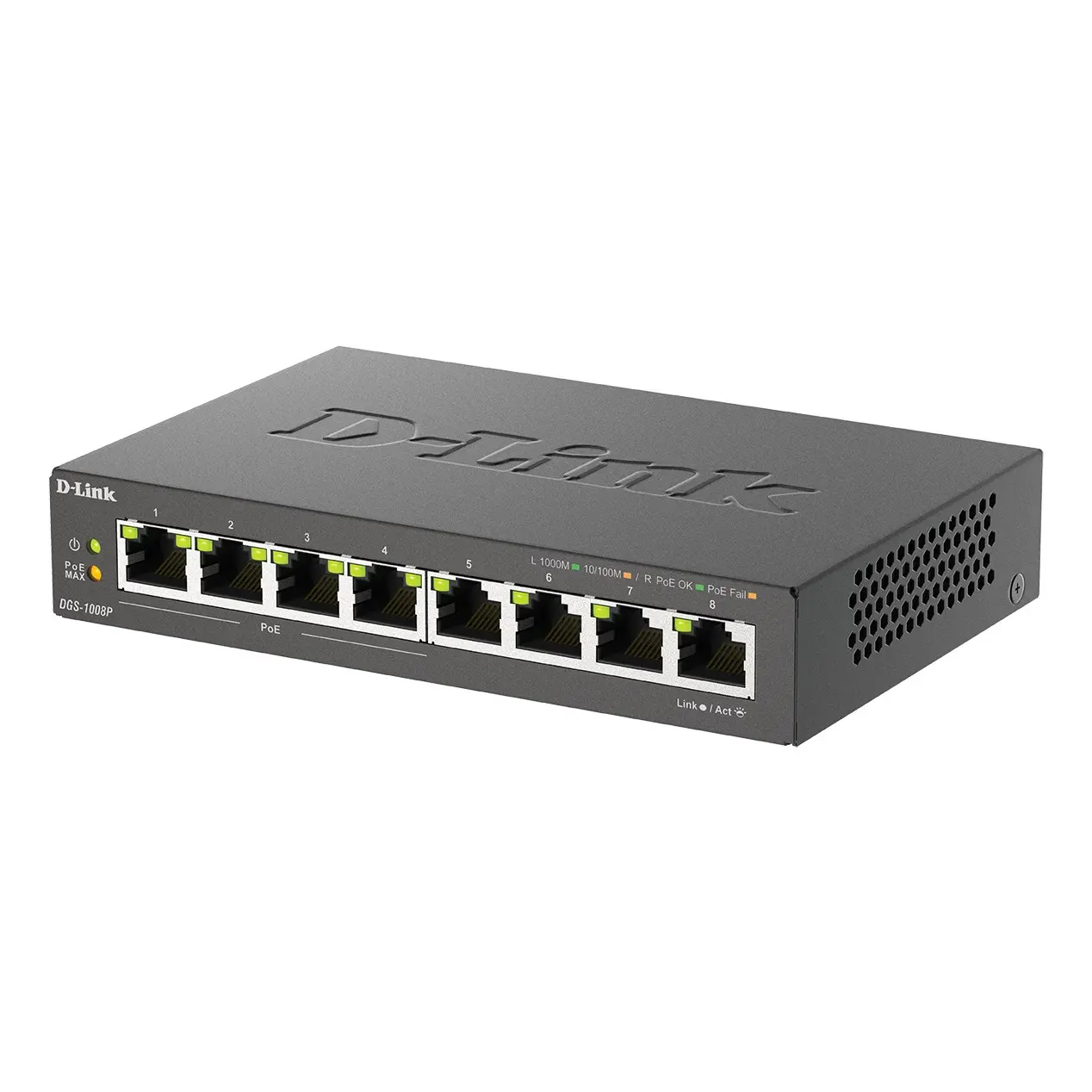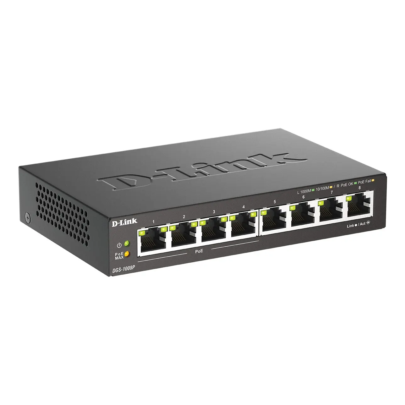 The D-Link DGS-1008P offers an economical way for SOHO and small to medium businesses (SMB) to benefit from the increased bandwidth of Gigabit Ethernet It provides 8 Gigabit ports for fast server deployment to meet increasing network loads.Gigabit Connection for HomeThe D-Link DGS-1008P 8-Port Gigabit PoE Unmanaged Desktop Switch enables home and office users to easily connect and supply power to Power over Ethernet (PoE) devices such as wireless access points (APs), IP cameras, and IP phones.It also provides the opportunity to add additional Ethernet devices like computers, printers, and Network Attached Storage (NAS) onto a network. This compact PoE switch operates quietly, making it ideal for use in virtually any room or office.Auto MDI/MDIX CrossoverAll ports support automatic MDI/MDIX crossover, eliminating the need for crossover cables or uplink ports.Each port can be plugged directly to a server, hub, router, or switch using regular straight-through twisted-pair Ethernet cables.Conserve EnergyThe DGS-1008P makes use of D-Link GreenTM eco-friendly technology, providing energy savings, reduced power consumption, and a longer product life without sacrificing operational performance or functionality.This switch helps to conserve energy through methods such as Link Status and Cable Length Detection. The Link Status feature automatically powers down ports that have no link, allowing the switch to save substantial amounts of energy by cutting power for unused ports. It can also detect connected cable lengths, and adjust power usage accordingly. In addition, the fan-less design extends the product’s life and also reduces noise.Power Over Ethernet+The first four ports of the DGS-1008P support the IEEE 802.3at PoE protocol.Each of the four ports can supply up to 30 watts, for a total PoE budget of 68 watts, allowing users to attach an IEEE 802.3at-compliant device to the DGS-1008P that requires no additional power. Use PoE+ for applications that are far from power outlets or when you want to minimize the clutter of extra cables.Compact and SilentThe compact design of the DGS-1008P allows placement in most locations, including those where space is at a premium.The desktop form factor provides everything you need to set up a new network or expand an existing network, while the fanless design ensures silent operation even in noise-sensitive workstations and meeting rooms.
