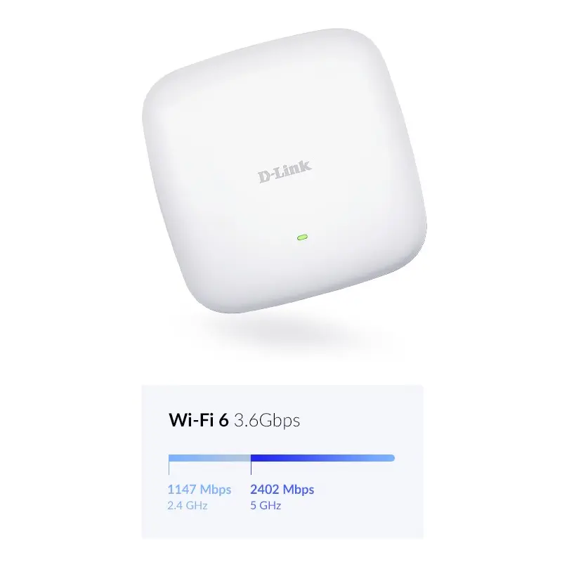 Business‑class Wi‑Fi 6.The Wi-Fi 6-ready DAP-X2850 provides businesses of all sizes with multi-gigabit speeds, significantly increased capacity and interference-free coverage, with centralised management. Ideal for SMB, retailers, hospitality, campuses, and managed service providers that need to keep data flowing, even in the most device-dense areas.Manage your business network with ease.The DAP-X2850 works with Nuclias Connect - a software-based management platform (with optional hardware controller) that can be used on-premises, or as a cloud solution hosted on a public cloud service. Admin tasks can be swiftly carried out from the Nuclias Connect app, or server/PC-based software for easy access, automation, and network scalability.Easily manage your network with Nuclias ConnectAutomate, monitor, manage and scale your network in line with business demand without the complexity or cost, through the centrally managed Nuclias Connect platform.Next-gen Wi-Fi 6Delivers greater network efficiency and lower latency, with nearly x4 the capacity of previous Wi-Fi standards2.5 Gigabit Uplinkx2 LAN ports (2.5G / 1G) offer an expansive backhaul to your wired network, eliminating bottlenecks at the APFree-to-download software & appRapidly setup, manage and monitor APs locally via our free network management software, or remotely with the Nuclias Connect appFlexible installation with PoESupports Power over Ethernet (802.3at) for a simpler installation with less cable clutter & includes a wall-plate design for installation on Ethernet wall sockets.Intelligent, secure performanceSuperior throughput with dual-band, 4x4 MIMO technology, band steering & airtime fairness intelligently manages users with WPA3™ wireless encryptionMinimise the hassle of admin tasksEmpower admins to work efficiently & effectively with role-based options that enable delegated access across your network. You can deploy, configure, update and expand rapidly, even across multiple sites, and utilise the intuitive dashboard to keep issues to an absolute minimum.Made for IoTTarget Wake Time (TWT) reduces power consumption of Wi-Fi 6 and IoT devices.Next‑gen Wi‑Fi 6 performance that turbo boosts your business.With combined Wi-Fi 6 802.11ax speeds of up to 3,600 Mbps, the DAP-X2850 enables large data transfers and superior quality video streaming, even in highly congested environments.Wi-Fi 6 delivers greater network efficiency and lower latency, with nearly x4 the capacity of previous Wi-Fi standards.Optimised Wi‑Fi for a superior client experience.The DAP-X2850 supports Band steering, 4x4 MU-MIMO and beamforming - all designed to work together to alleviate congestion.And Load Balancing and Airtime Fairness technology distributes workloads between APs for optimum resource utilisation - allowing every device in your network to seamlessly get the best connectivity possible, without putting a strain on your whole network.Multiple Operation Modes.The DAP-X2850 can be configured to your network needs and optimise performance.- Access point- Wireless distribution system (WDS) with access point- WDS/bridge (no AP broadcasting)- Wireless clientSimple and clean installation, anywhere.It can be ceiling-mounted, wall-mounted, or placed on a desk. The DAP-X2850’s PoE function allows for easy installation with a single cable. Perfect for advanced installations in areas where power outlets are not readily available.Advanced and customisable on‑premise network management.Nuclias is a unified network management tool with cost-effective scalability, customisable controls, and is designed as a solution for every type of business.Efficient multi‑site management.Manage multiple sites easily by setting authority levels for head and branch-level offices and setting different configurations. Network devices can be pre-configured before being dispatched to regional offices, allowing faster and more efficient deployments.Manage your business network, like never before.Nuclias Connect enables you to manage and control your network from anywhere with an Internet connection. It provides an extensive understanding of your network and its users through traffic analytics and status reports, which can be viewed at a glance through the intuitive interface via a browser or the app. Insights derived from this traffic data can be used to create business value, and traffic can be viewed across the entire network, and to the level of a single AP.Your Guests Online in No Time with a Captive Portal.Get your guests online quickly and easily with a captive portal. Not only can you let them connect using just their email address, Facebook or Google account, it also gives your business the opportunity to increase brand awareness and advertise promotions. At the same time, it can provide user insights that allow businesses to better understand their customers.Scale your Wi‑Fi alongside your business.Nuclias Connect gives you the financial and technical flexibility to expand from a small network to up to 1,000 Access Points while retaining a robust and centralised management system.Dedicated controller to manage your network.The Nuclias Connect Hub (DNH-100) is an optional but efficient hardware controller that’s dedicated to provide an inexpensive, maintenance-free and ready-made solution for configuring and managing your network. Simply plug in and power on.