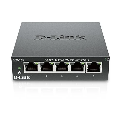 - Plug and Play operation- 5 Fast Ethernet ports- Non-blocking architecture: simultaneous full speed on all ports- Fanless, silent operation to fit in any environment- Quality of Service (QoS) queues for traffic prioritisation- Solidly built with metal housing- D-Link Green™ technology, saves energy and increases the product’s lifespanD-Link’s DES-105 Fast Ethernet switch provides a cost-effective way for SOHO and SMB to create a small network and connect computers, wireless Access Points, IP cameras, network printers and other Ethernet devices quickly and easily without complicated configurations. This switch comes with 5 Fast Ethernet ports with an auto-sensing function to detect the maximum speed of the connected devices, allowing you to run your network with the best possible performance. Its fanless design makes this switch completely silent, ideal for offices, libraries or meeting rooms.Robust designThe DES-105 are designed with durability and performance in mind. The sturdy metal housing will protect the switch against accidental harm, while helping to dissipate heat and to reduce stress on internal components. The visible LEDs allow for an easy reading of each port status, helping to troubleshoot connectivity problems. For a convenient placement, this switch comes with a wall mounting kit and a slot for a Kensington security lock to protect it from theft.QoS (Quality of Service)Despite being an unmanaged, Plug and Play switch, the DES-105 is able to classify network traffic by assessing the 802.1p field in the Ethernet frames, and forward them out of its ports depending on their priority. This allows for a smooth integration of video, voice and data traffic without delays or loss of quality.Power-saving technologyThe DES-105 is part of D-Link Green™, D-Link’s eco-friendly technology, providing energy savings, reduced power consumption, and a longer product lifespan without sacrificing operational performance or functionality. This switch implement the 802.3az Energy Efficient Ethernet (EEE) standard, which can save a substantial amount of energy by detecting the port status, putting them in low-power, stand-by mode when no network traffic is detected. This helps businesses to save money by reducing their electricity bills with no compromise on performance.