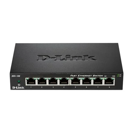 - Plug and Play operation- 8 Fast Ethernet ports- Non-blocking architecture: simultaneous full speed on all ports- Fanless, silent operation to fit in any environment- Quality of Service (QoS) queues for traffic prioritisation- Solidly built with metal housing- D-Link Green™ technology, saves energy and increases the product’s lifespanD-Link’s DES-108 Fast Ethernet switch provides a cost-effective way for SOHO and SMB to create a small network and connect computers, wireless Access Points, IP cameras, network printers and other Ethernet devices quickly and easily without complicated configurations. This switch comes with 8 Fast Ethernet ports with an auto-sensing function to detect the maximum speed of the connected devices, allowing you to run your network with the best possible performance. Its fanless design makes the DES-108 completely silent so it is ideal for offices, libraries or meeting rooms.Robust designThe DES-108 is designed with durability and performance in mind. The sturdy metal housing will protect it against accidental harm, while helping to dissipate heat and to reduce stress on internal components. The visible LEDs allow for an easy reading of each port status, helping to troubleshoot connectivity problems. For a convenient placement, this switch comes with a wall mounting kit and a slot for a Kensington security lock to protect it from theft.QoS (Quality of Service)Despite being an unmanaged, Plug and Play switch, the DES-108 is able to classify network traffic by assessing the 802.1p field in the Ethernet frames, and forward them out of its ports depending on their priority. This allows for a smooth integration of video, voice and data traffic without delays or loss of quality.Power-saving technologyThe DES-108 is part of D-Link Green™, D-Link’s eco-friendly technology, providing energy savings, reduced power consumption, and a longer product lifespan without sacrificing operational performance or functionality. This switch implements the 802.3az Energy Efficient Ethernet (EEE) standard, which can save a substantial amount of energy by detecting the port status, putting them in low-power, stand-by mode when no network traffic is detected. This helps businesses to save money by reducing their electricity bills with no compromise on performance.