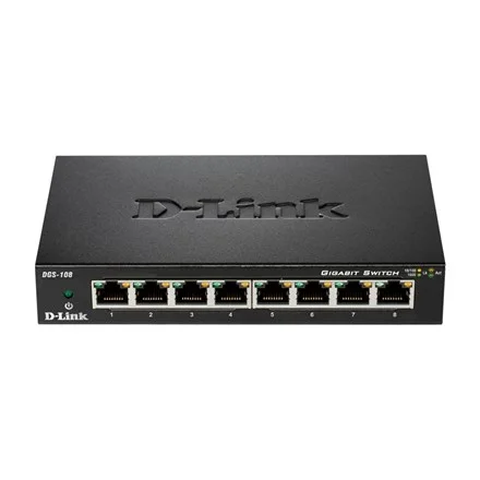 - Plug and Play operation- 8 Gigabit Ethernet ports- Non-blocking architecture: simultaneous full speed on all ports- Fanless, silent operation to fit in any environment- Quality of Service (QoS) queues for traffic prioritisation- Solidly built with metal housing- Cable diagnostics function to detect faulty network cables- D-Link Green™ technology, saves energy and increases the product’s lifespanD-Link’s DGS-108 Gigabit Ethernet switch provides a cost-effective way for SOHO and SMB to create a small network and connect computers, wireless Access Points, IP cameras, network printers and other Ethernet devices quickly and easily without complicated configurations. This switch comes with 8 Gigabit Ethernet ports with an auto-sensing function to detect the maximum speed of the connected devices, allowing you to run your network with the best possible performance. Its fanless design makes the DGS-108 completely silent, ideal for offices, libraries or meeting rooms.Robust designThe DGS-108 is designed with durability and performance in mind. The sturdy metal housing will protect the switch against accidental harm, while helping to dissipate heat and to reduce stress on internal components. The visible LEDs allow for an easy reading of each port status and speed, helping to troubleshoot connectivity problems. For a convenient placement, the DGS-108 comes with a wall mounting kit and a slot for a Kensington security lock to protect it from theft.QoS (Quality of Service)Despite being an unmanaged, Plug and Play switch, the DGS-108 is able to classify network traffic by assessing the 802.1p field in the Ethernet frames, and forward them out of its ports depending on their priority. This allows for a smooth integration of video, voice and data traffic without delays or loss of quality.Cable diagnostics functionThe cable diagnostics function enables users to quickly troubleshoot faulty network cables that may lead to transmission errors. At startup, the switch performs a micro-test to assess the quality of the cables connected to its ports. If a fault is detected, the ambar LED will lit up. If the cables pass the test, the green LED will be illuminated, indicating that the network is error-free. This feature can save valuable time when trying to single out a faulty cable that causes problems in the whole network.Power-saving technologyThe DGS-108 is part of D-Link Green™, D-Link’s eco-friendly technology, providing energy savings, reduced power consumption, and a longer product lifespan without sacrificing operational performance or functionality. This switch implements the 802.3az Energy Efficient Ethernet (EEE) standard, which can save a substantial amount of energy by detecting the port status, putting them in low-power, stand-by mode when no network traffic is detected. Additionally, the Green Ethernet™ technology in the DGS-108 can detect the length of the network cables connected to its ports and provide only the right amount of energy required. This helps businesses to save money by reducing their electricity bills with no compromise on performance.