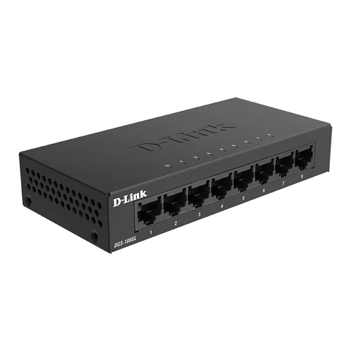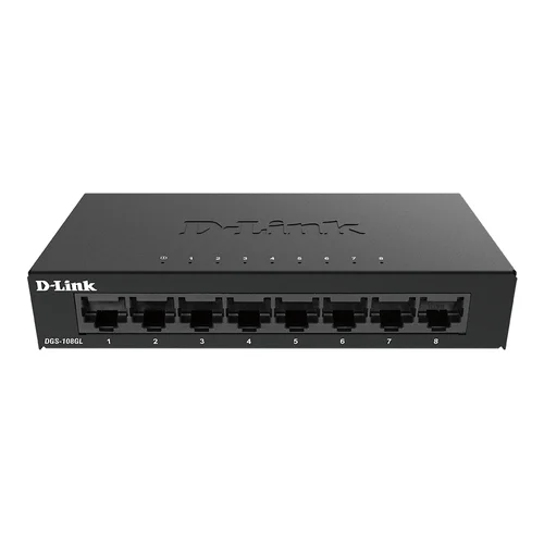 Effortless Gigabit networking.Easily upgrade or extend your home or small business network with high‑speed energy‑saving Gigabit connectivity. It’s optimised for intensive 4K video streaming, surveillance, large file downloads and conferencing.Gigabit EthernetSave time transferring large files and improve sharing and productivityCompact Metal HousingSturdy, compact metal housing with fanless design for silent operationEnergy Efficient DesignAutomatic power saving features to reduce power usageEasy SetupPlug-and-play installation enables you to expand the network in secondsPlug‑and‑play. Easily extend a network.The DGS-108GL is a plug-and-play device that requires no advanced technical configuration. You can easily connect multiple computers within minutes, and start sharing an internet connection, files, music, and video across your small office or home network.Effortless traffic optimisation.With Gigabit transfer speeds on each port, you can rapidly transfer files between connected computers and devices. The switch features 802.1p Quality of Service (QoS), which automatically organises and prioritises time-sensitive and critical data for efficient delivery, allowing for buffer-free video streaming as well as smooth video and voice calls.Designed for life, built to last.The DGS-108GL features a fanless design for silent operation, reduced energy consumption, and increased reliability by eliminating a common point of failure. Its sturdy compact metal housing ensures the product can withstand wider operating temperatures by helping to dissipate heat and reduce stress on internal components.Energy Saving.The compact, metal housing and fanless design mean the switches can be placed virtually anywhere and operate silently. The DGS-108GL is designed with energy efficiency in mind. The switches automatically reduce power to ports that are inactive or not connected, and support the IEEE 802.3az Energy-Efficient Ethernet standard.