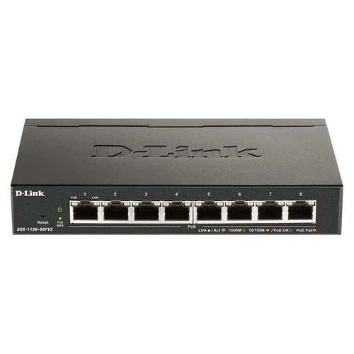 Powerful and flexible networking solution for small, medium, and enterprise businesses. Simple. Easy. SmartWebUI Web UIEasy to use web interface to access management features.Static Routing VLANsSegment your network into VLANs.Surveillance mode Surveillance Mode InterfaceGet a snapshot of your security topology in an instant.Advanced Security FeaturesThe DGS-1100 series’ web user interface gives administrators an easy way to manage Layer 2 features, such as VLANs, Spanning Tree Protocol (STP), and link aggregation (desktop models utilize Static Trunk). With powerful security features including IGMP snooping, Static MAC, and Storm Control, these smart managed switches are a versatile solution for deployments that require easy to configure functionality without added complexities.Simplify Network ManagementD-Link’s free Network Assistant (DNA) utility displays all your connected devices and makes first-time configuration a breeze. The free D-View 7 Network Management System comes with a license for 25 nodes and 2 probes and full access to the management tools.Full PoE SupportThe DGS-1100-08PV2 supports IEEE 802.3af/at Power over Ethernet on all eight copper access ports. Power over Ethernet greatly simplifies the installation of PoE-enabled devices such as VoIP phones and IP cameras in remote locations with no immediate access to a power outlet. Each individual port has capacity to support up to 30W of PoE power, while the switch has an overall budget of 64W.Easy TroubleshootingThe DGS-1100 Series features Loopback Detection and Cable Diagnostics to help network administrators find and solve network problems quickly and easily.Loopback Detection detects loops created by a specific port and automatically shuts down the affected port. The Cable Diagnostics feature is designed for network administrators to quickly examine the quality of the copper cables, recognize the cable type, and detect cable errors.Green TechnologyD-Link Green technology enables the DGS-1100 Smart Managed Switches to save power without sacrificing performance. The desktop models in the series utilize a fanless design, for silent and energy-efficient operation. All models are also IEEE 802.3az-compliant and feature Link Status detection.