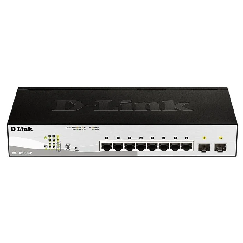 The D-Link DGS-1210-08P is an 8-port managed PoE switch offering energy efficiency and easy management for small to medium-sized businesses.