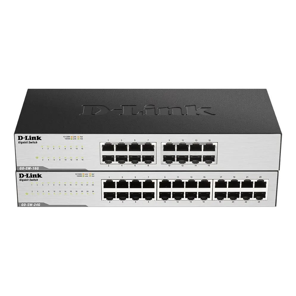The GO-SW-16G/24G 16/24‑Port Gigabit Easy Desktop Switch is an economical, plug-and-play networking switch solution for SOHO and small and medium businesses wanting to benefit from the increased bandwidth of Gigabit Ethernet. It provides 16 or 24 10/100/1000 Mbps ports that enable you to easily expand your network and provide a quick way to upgrade your network to fast connectivity.The GO-SW-16G/24G 16/24‑Port Gigabit Easy Desktop Switch is an economical, plug-and-play networking switch solution for SOHO and small and medium businesses wanting to benefit from the increased bandwidth of Gigabit Ethernet. It provides 16 or 24 10/100/1000 Mbps ports that enable you to easily expand your network and provide a quick way to upgrade your network to fast connectivity.Upgrade to Gigabit NetworkingWith data transfer speeds of up to 2000 Mbps at full-duplex, this switch is ideal for quick file transfers, online gaming, and smooth streaming media. It features easy-to-access Ethernet ports with LED indicators per port to easily distinguish link status. Auto-MDI/MDIX crossover makes connections a cinch; just plug in your cables and you are ready to go.Conserve EnergyThe GO-SW-16G/24G supports IEEE 802.3az Energy-Efficient Ethernet, which saves energy and reduces heat automatically without sacrificing performance or functionality. The switch can detect when a connected computer is shut down or when there is no Ethernet traffic and can automatically reduce the power used for that port, cutting power usage substantially. In addition, the switch optimises power usage for each port based on the length of cable connected to it, using only as much power as is required. Both of these features work together to help you save power automatically.Reliable Plug and Play InstallationThe GO-SW-16G/24G is a plug-and-play device that requires no configuration, so setup is simple and hassle-free, and you can easily connect multiple computers, share files, music, and video across your home or small office network, or even create a multiplayer gaming environment. IEEE 802.3x flow control on each port minimizes dropped packets when the port’s receiving buffer is full, giving you a more reliable connection for all of your connected devices.