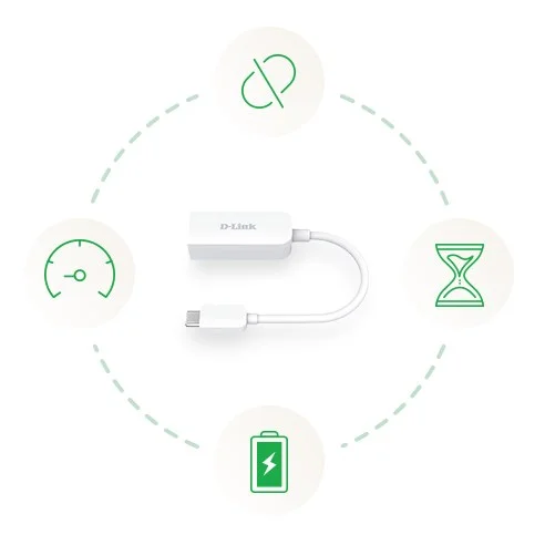2.5 GbpsUpgrade your computer to 2.5 Gbps Ethernet.USB-C connectorIdeal for ultra-thin laptops with USB-C / Thunberbolt 3 connections and no ethernet port.Install in secondsSimply plug in the adapter and the built-in driver will be installed in seconds.Dynamic Power ManagementReduces power consumption during times of light traffic, when idle, or when the Ethernet cable is unplugged.Upgrade your laptop to 2.5 Gbps Ethernet.Instantly add multi-Gigabit connectivity to your laptop computer or desktop. Just plug the adapter into an available USB-C port and you’re ready to connect to your router or switch at 2.5x the speed of a standard Gigabit connection.More than twice as fast as Gigabit Ethernet.Simply plug into your computer and enjoy fast 2.5 Gigabit Ethernet that allows you to transfer large files in no time, or make light work of backups to a server or network storage device. This reliable adaptor allows you to connect to multi-gigabit speeds instantly, perfect for network intensive workloads.Easy to install and use.Simply plug the adapter into an available USB-C port. The installation software is already preloaded on the adapter, so there’s no need for CDs or downloads1. The portable compact design lets you easily slip the adapter into your pocket or laptop bag and take it with you anywhere.Green technology that saves energy.Power to the adapter is provided directly from the USB Type-C port and not only supports the USB 3.0 standard’s power-saving features, but also includes an energy-saving suspend and resume function to minimise power consumption when network traffic is light, the device is idle, or when the Ethernet cable is unplugged. Good for the environment, and ever better for your device’s battery life.Works with existing networks.The DUB-E250 is fully backwards compatible with existing Fast Ethernet or Gigabit networks, allowing you to connect to a wired network wherever you are.