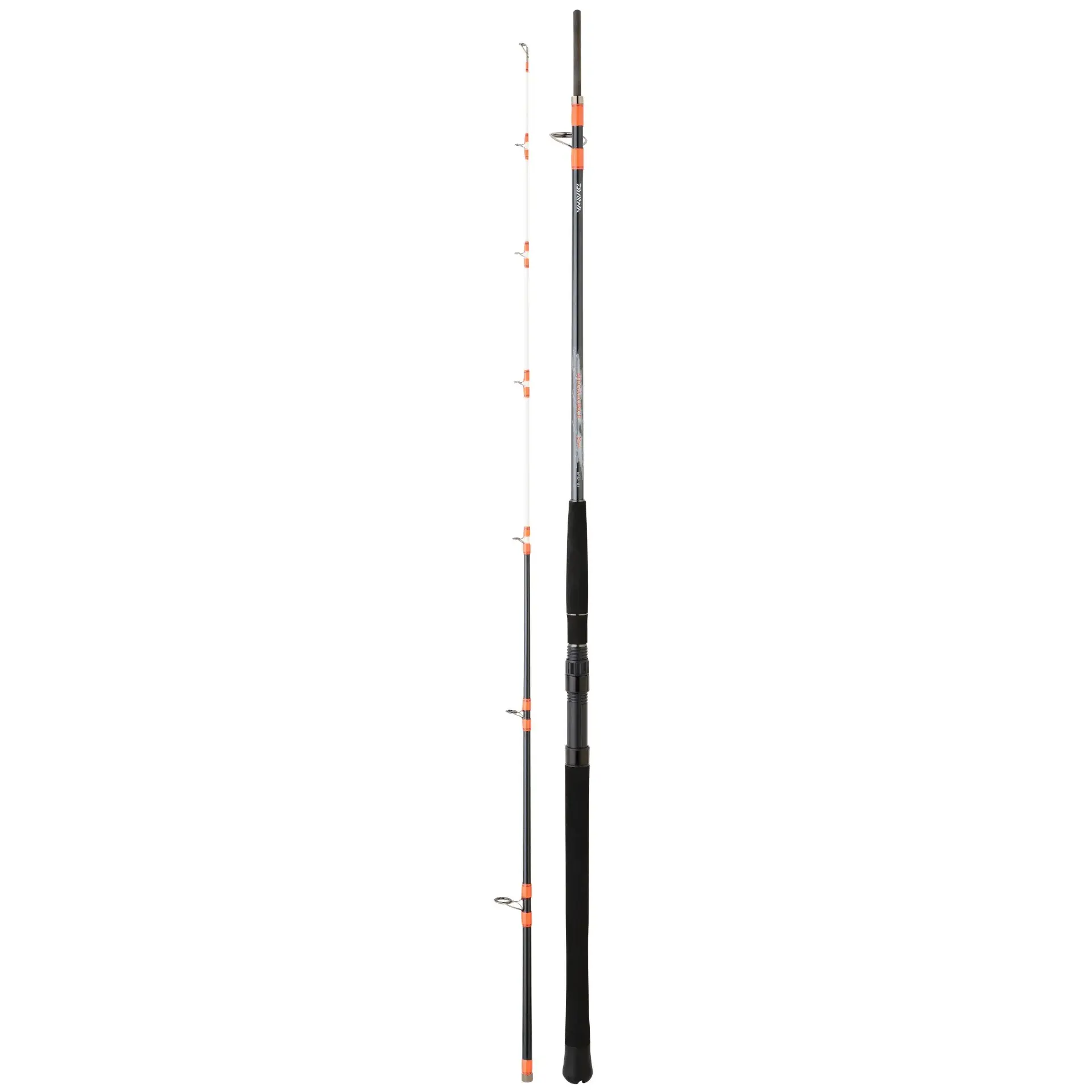 The Daiwa Megaforce Boat Spinning Rod is engineered for boat fishing, offering robust performance suitable for heavy-duty applications and drop-shotting with feather rigs. The ST models feature a solid tip for enhanced bite detection. Fluorescent orange wrappings ensure high visibility, even in low-light conditions.