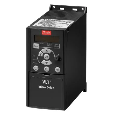 Inverters are delivered without Control Panel, please order seperate. Inverter VLT FC51 - Three Phase Input. The VLT Micro Drive is a general purpose drive that can control AC motors up to 22 kW. It ‘s a small drive with maximum strength and reliability. Features and benefits. VLT FC51 Inverter Drive. Three phase input. Delivered without Control Panel. - Control panel with LCD availabe in two versions:. - LCP without potentiometer IP54, stock no. ; 891-8915 891-8915. - LCP with potentiometer IP21, stock no. ; 891-8918 891-8918. Process PI-controller. Automatic Energy Optimizer (AEO). Automatic Motor Tuning (AMT). 150% motor torque up to 1 minute. Flying start (catch a spinning motor). Electronic Thermal relay (ETR). Smart Logic Controller – digital/analog input/output. Built-in brake functions. Built-in RFI filter. Side-by-side mounting. Applications:. Centrifugal pumps. Radial/axial fans. Compressors. Conveyors