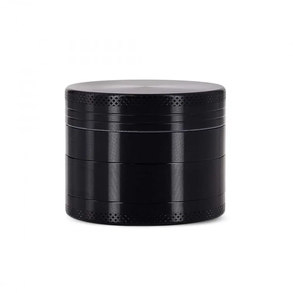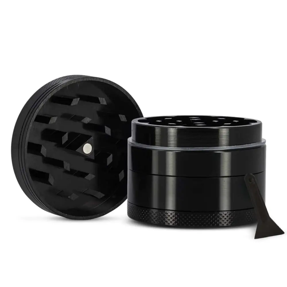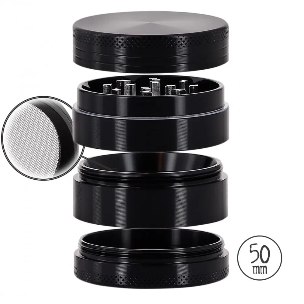 magnetic grinder with 50 mm black filter. deluxe black anodized aluminum grinder. a magnetic grinder lid. an unscrewable grinder. a container with integrated sieve. a basis for recovery. diamond grinding tip for more efficiency. a plastic squeegee.