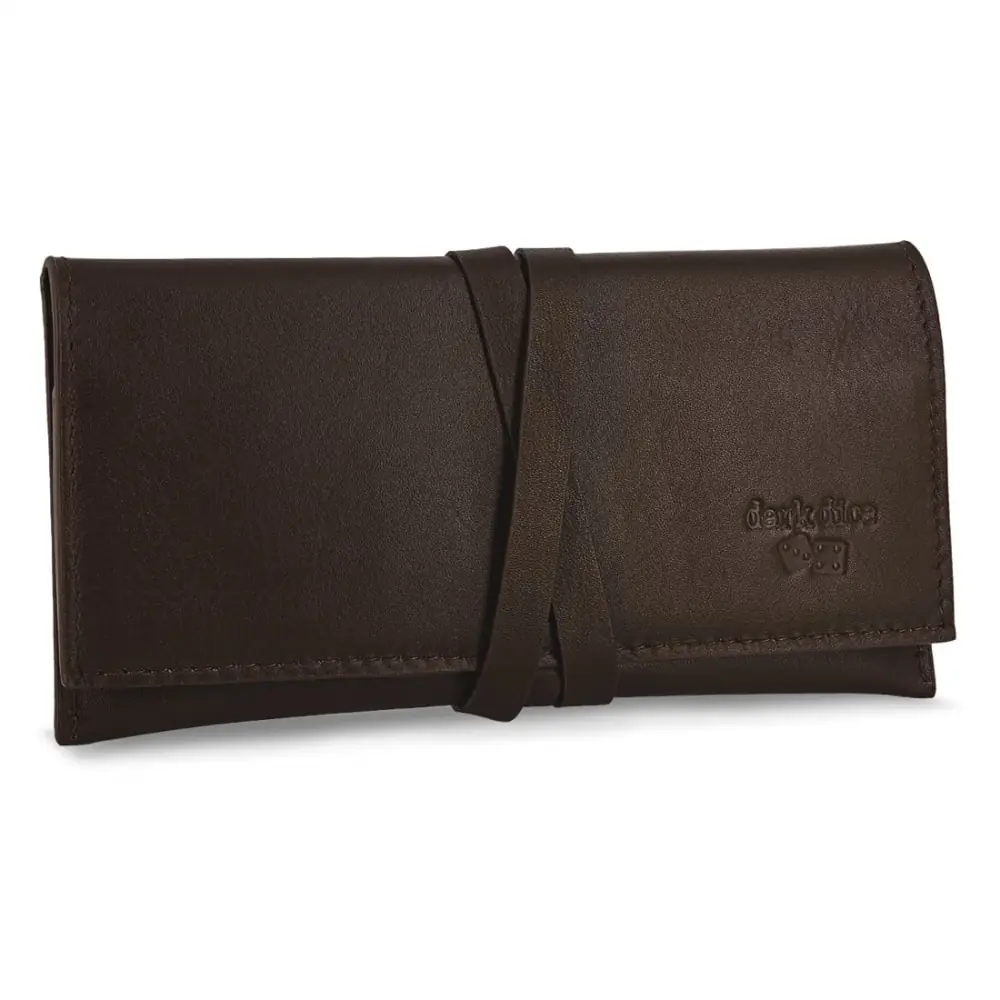 dark dice talisman brown tobacco pouch in 100% leather. strap closure double notch for leaves two compartments for tobacco and accessories. compact and elegant.