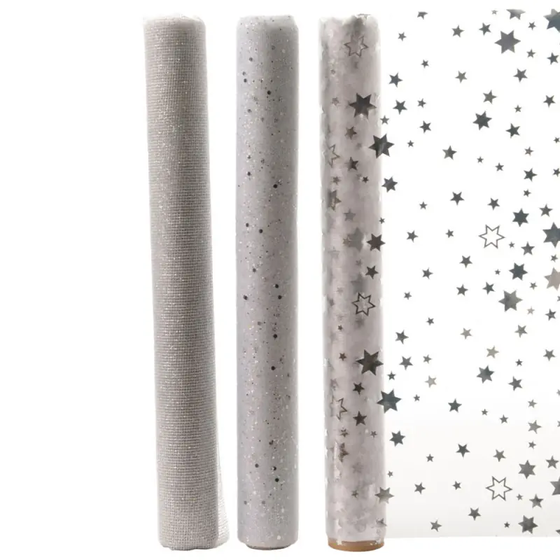 Enhance your dining experience with this elegant transparent organza table runner featuring glitter.