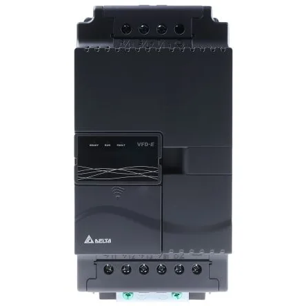 VFD-E-Series - Three Phase Input. The inverter VFD-E series is a sensorless vector AC micro drive. The VFD-E series represent a low horsepower, constant torque and IP20 rated drive. Modular in design with flexible extension cards and a built-in PLC function, the VFD-E drive offers the ability to write and to execute simple Ladder Logic programs. This state-of-the-art series meets a full range of application requirements. Features and benefits. Three phase input. Output frequency 0.1 to 600 Hz. Modular ; compact design. Built-in PLC function. Built-in EMI filter. RFI-switch for mains. Easy DC BUS sharing. Flexible extension. Complete Protection. Optional Fieldbus Modules (DeviceNet, Profibus, LonWorks and CANopen). Drive does not include keypad, please order separately (Stock-no.: 785-8581). Applications:. Smaller cranes. Washing machines. Grinding machine. Drilling machine. Wood machine. Webbing loom. Air conditioner for large buildings. Water supply system for large buildings