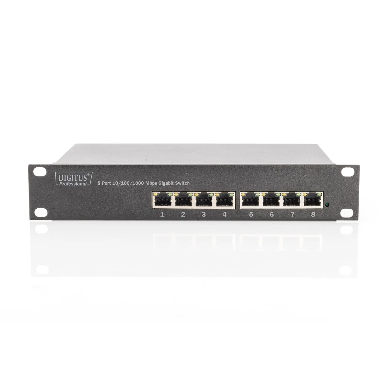 Ideal for use in 10" wall-mounted enclosures- 8 x 10/100/1000Base-T ports: Provides high flexibility and speed for your network devices- Network standards: Complies with IEEE 802.3, IEEE 802.3u, IEEE 802.3ab and IEEE 802.3x standards, ensuring broad compatibility- Non-blocking, non-head-of-line forwarding: Ensures that your data is transferred quickly and efficiently, without delays- Back-pressure and bandwidth control: Enables precise control and management of bandwidth on each port- Store-and-forward technology: Optimizes data transfer by temporarily storing and checking packets before they are forwarded- Automatic speed and duplex detection: Automatically detects and adjusts the speed and duplex mode (20 / 200 / 2000 Mbit in full duplex mode)- Auto MDI/MDI-X function: Simplifies cabling as no crossover cables are required- 16Gbps backplane: Ensures a high data transfer rate and efficient network performance- Supports up to 8K MAC addresses: Provides enough capacity for growing networks- Power consumption: Low power consumption of only 5 wattsThe DIGITUSĀ® 8-Port Gigabit Ethernet Switch provides 8 10/100/1000 Mbps RJ-45 ports with auto-negotiation. All ports support the Auto MDI/MDIX function, which eliminates the need for crossover cables and uplink ports. Low cost, ease of use and high performance are the strengths of the DIGITUSĀ® Gigabit Ethernet 8-Port Switch, making it an excellent choice for your network. Thanks to its compact dimensions, the switch can be installed in 10-inch wall-mounted housings. The mounting brackets are included with the product.