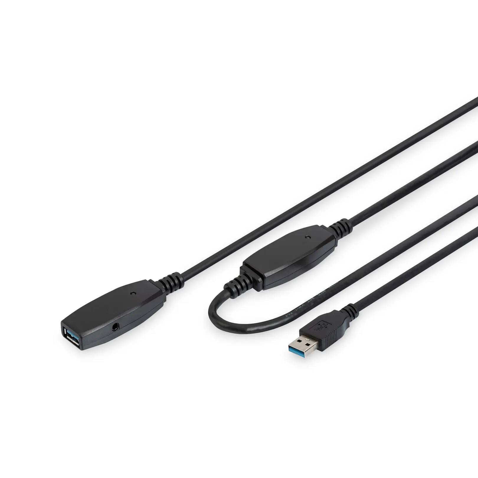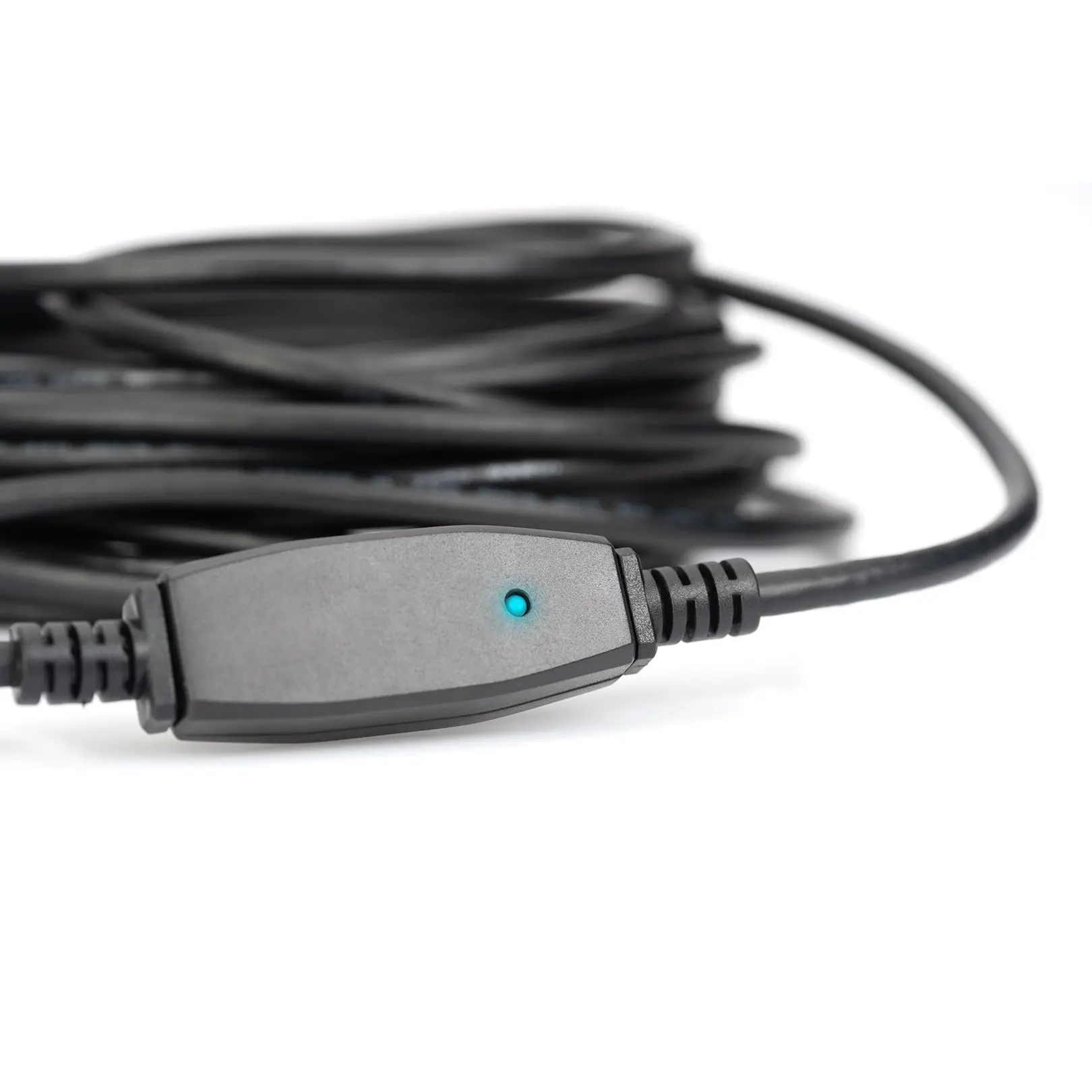 You can also use remote USB devices with this active USB 3.0 extension cable with signal amplifier- Stable signal transmission thanks to active signal amplifier- No power loss despite 15 m cable length- Data transfer rates up to 5 Gbps- LED function indicator- Plug-and-play - plug in and get started.- Connect remote USB 3.0 devices as wellIn addition, connect more distant USB 3.0 devices using this active extension cable. Benefit from stable connections and avoid power losses even at greater distances using the integrated signal amplifier. The integrated LED function indicator signals the status of the signal amplifier. Connect your USB 3.0 devices such as printers or scanners to your PC or laptop even over greater distances. The integrated electronics ensures smooth data transfer without loss at all times. With the active USB 3.0 extension cable series, DIGITUS® offers solutions from 10 to 20 m in length. No more connection problems when using longer USB cable connections!