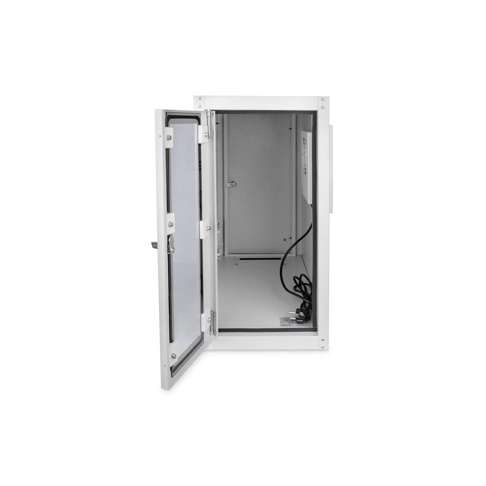 Computer housing with active ventilation including filter system, and levelling feet- Active ventilation with filter system (2.3 m³ air flow per minute)- Active fan can be switched off separately from the outside- Lockable front door and lockable service opening on the back- Cable feedthrough in the back of the housing base and in the roof sealed with foam rubber- Offers enough space for all standard PC housings- Front door with glass window for viewing of the PC function display at any time- Protection type: IP54The computer housing from DIGITUS® features robust construction made of 1.5 mm thick steel sheet, which leaves nothing to be desired in terms of value. The built-in filter fan ensures adequate ventilation and heat dissipation. Thanks to the integrated filter, dust and dirt are kept out to protect the electronic components within the housing. The front and back doors can each be locked. Connection cables can be fed in through an opening in the base or an opening in the roof, with integrated foam rubber seals also increasing protection against dust and foreign objects. The sturdy leveling feet ensure secure positioning and optimal adjustment to the ground surface. The housing is perfectly suited for production lines, warehouses, laboratories and other similar fields of application.