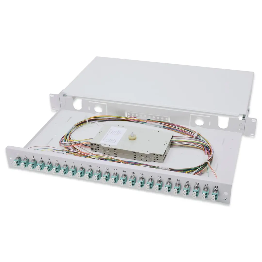 FO splice box, 1U, equipped, 24x LC DX, OM3,incl. splice cassette, colored pigtails, couplers
