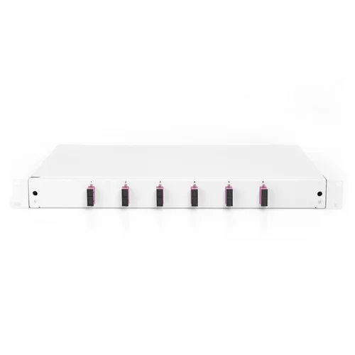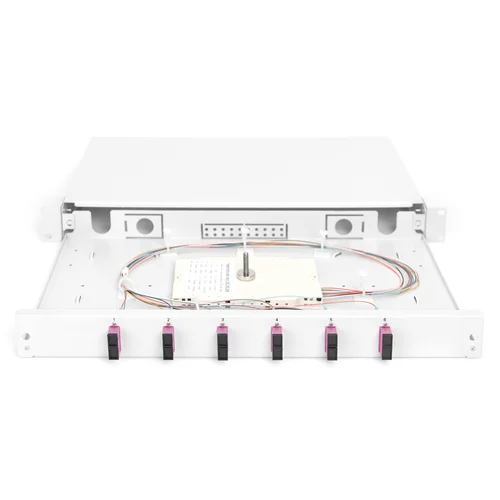 FO splice box, 1U, equipped, 6x SC DX, OM4,incl. splice cassette, colored pigtails, couplers