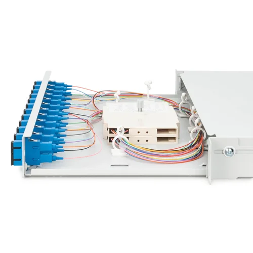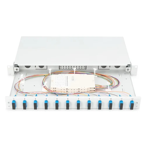 FO splice box, 1U, equipped, 12x SC DX, OS2,incl. splice cassette, colored pigtails, couplers
