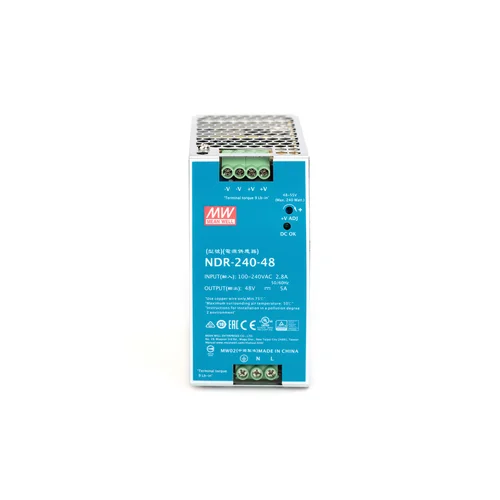 Compact 48V DC power supply with 240W output, designed for industrial applications and DIN rail mounting.