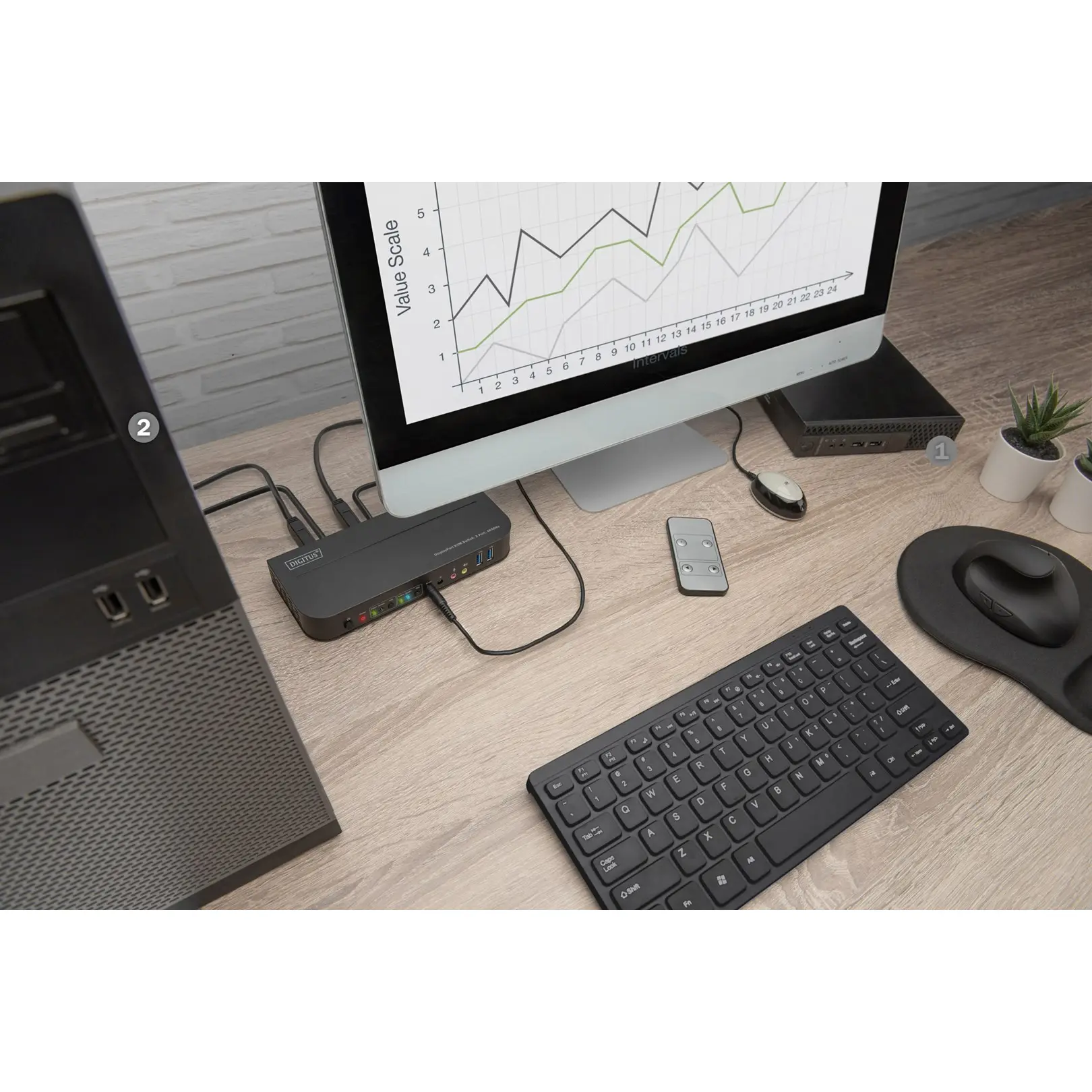 Easily switch between 2 PCs using one USB keyboard and mouse with the Digitus KVM Switch.