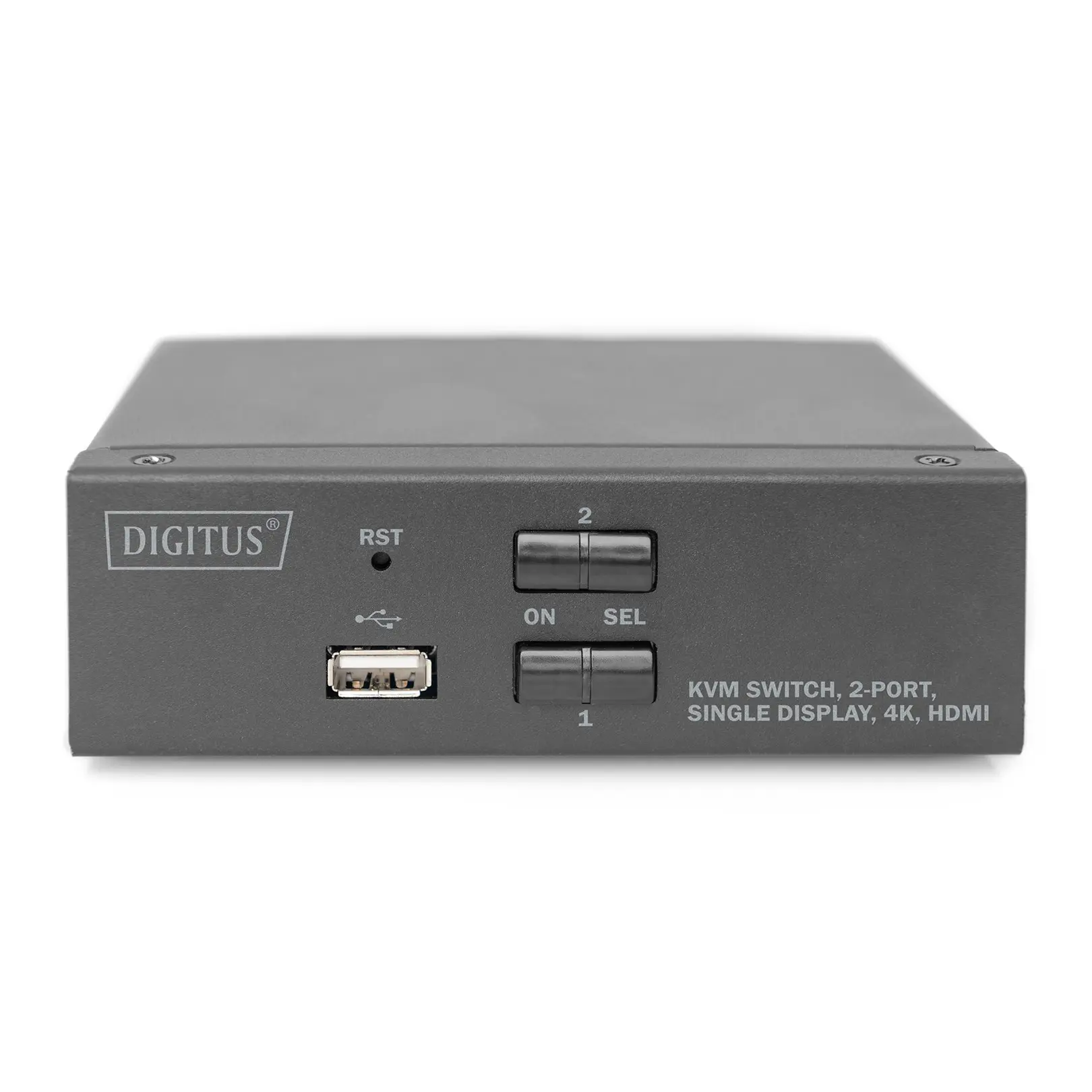Operate 2 PCs using a USB keyboard and mouse combination – switch between two computers by pressing a button- Use one monitor, a mouse and keyboard to operate two computers with single display- Supports a maximum UHD resolution of 4K / 30 Hz + FreeSync- USB ports for mouse and keyboard- Audio connections for microphone/speaker, supports Dolby True HD and DTS HD Master Audio- Integrated USB hub with USB A port for additional peripheral equipment- Switching between the PCs via switch on the KVM switch or hot key on the keyboard- LED status and functional displays on the front side- Laborious replugging of connection cables no longer necessary- Real Plug and Play - no software or driver installation required (BIOS hardware connection)- Sturdy metal housingWith the DIGITUS® 2-Port KVM Switch for single displays, you can operate two 4K-compatible PCs using a single USB keyboard and mouse combination. By pressing a button or hot key, you can switch comfortably between the two PCs and are spared the trouble of replugging all cables. Output to one monitor is provided via the HDMI® output on the rear side. You can also switch between the audio signals for the microphone and speaker. In addition, a USB port is included on the front side for use with other peripheral devices like USB sticks or external hard drives on both PCs. The connected peripheral devices are each assigned to the active PC. Status LEDs on the front side of the switch show you the current configuration at all times. The slim switch features the added benefits of sturdy metal housing.