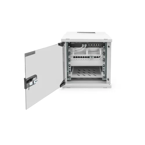 The DIGITUS® wall-mounted enclosure SOHO PRO series is characterized by its efficient delivery in an optimized flat pack and particularly user-friendly installation.- Compact housing for installations where space is limited- Simplified logistics: delivered unassembled in an optimized flat pack- Quickly ready for use: Particularly user-friendly, quick installation with just a few screws- Flexible cable routing options thanks to protected openings in the roof and floor- Lockable safety glass door with 200° door opening angle- Depth-adjustable 254 mm (10") profile rails- Load capacity for the installation of components: 30 kgWhether in the home, office or in sub-distribution boards with limited space: With the compact 254 mm (10") solutions from the SOHO PRO series, you can install your network wherever you want. Available in three height units (6U, 9U, 12U), the wall-mounted enclosures are equipped with a full glass door and a cable entry in the roof and base. A pair of galvanized 254 mm (10") profile rails labelled with legible height units are installed inside. These can be adjusted in depth. Each cabinet is a robust steel construction made of up to 1.5 mm thick sheet steel. The coloring takes the form of electrostatic powder coating in the standard colors grey (RAL 7035) and black (RAL 9005). The door hinges can be changed. The network enclosures are supplied unassembled in an optimized flat pack. Assembly takes place in just a few steps and is child's play thanks to the enclosed step-by-step instructions.