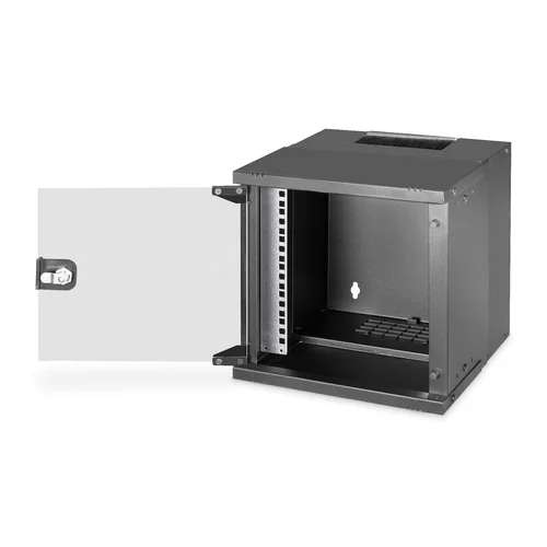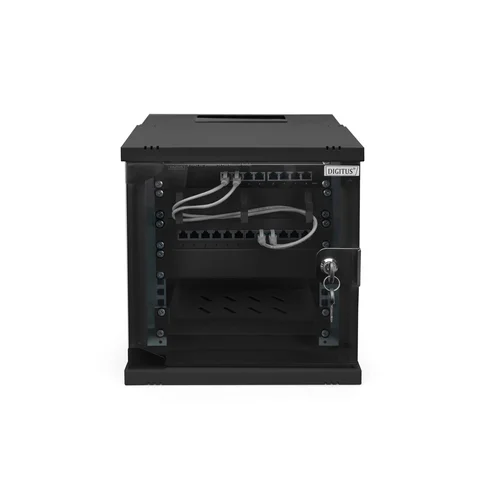 The DIGITUS® wall-mounted enclosure SOHO PRO series is characterized by its efficient delivery in an optimized flat pack and particularly user-friendly installation.- Compact housing for installations where space is limited- Simplified logistics: delivered unassembled in an optimized flat pack- Quickly ready for use: Particularly user-friendly, quick installation with just a few screws- Flexible cable routing options thanks to protected openings in the roof and floor- Lockable safety glass door with 200° door opening angle- Depth-adjustable 254 mm (10") profile rails- Load capacity for the installation of components: 30 kgWhether in the home, office or in sub-distribution boards with limited space: With the compact 254 mm (10") solutions from the SOHO PRO series, you can install your network wherever you want. Available in three height units (6U, 9U, 12U), the wall-mounted enclosures are equipped with a full glass door and a cable entry in the roof and base. A pair of galvanized 254 mm (10") profile rails labelled with legible height units are installed inside. These can be adjusted in depth. Each cabinet is a robust steel construction made of up to 1.5 mm thick sheet steel. The coloring takes the form of electrostatic powder coating in the standard colors grey (RAL 7035) and black (RAL 9005). The door hinges can be changed. The network enclosures are supplied unassembled in an optimized flat pack. Assembly takes place in just a few steps and is child's play thanks to the enclosed step-by-step instructions.