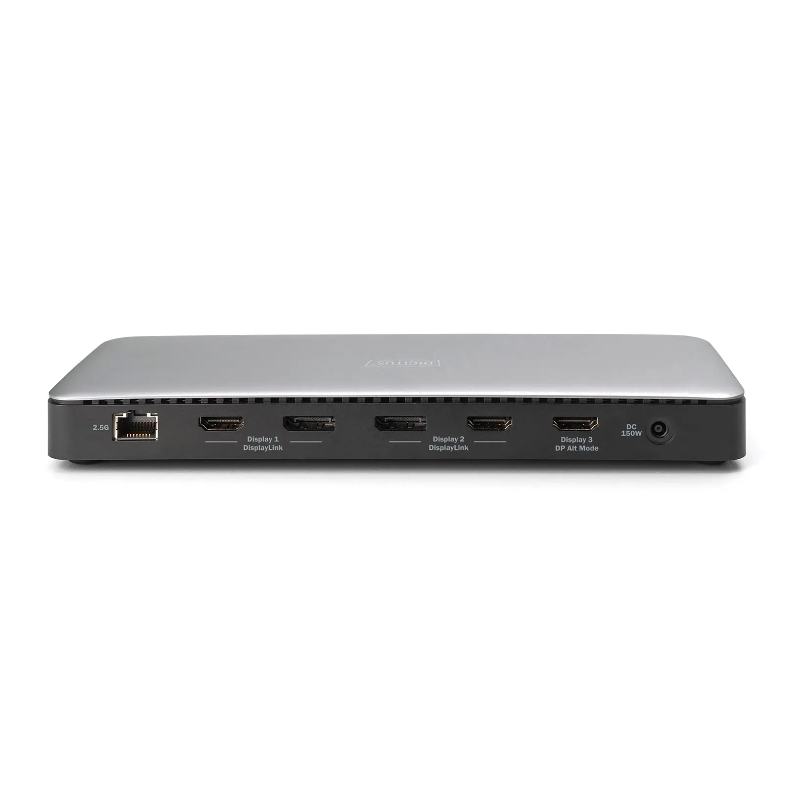 Our 13-port USB-C docking station expands the connection options for notebooks and offers a complete solution for the entire workplace- 3x HDMI + 2x DP (4K/60Hz) - Extend your workstation to up to 3 external monitors with a choice of 5 video ports- Supports dual monitor (2x 4K/60Hz) & triple monitor (3x 4K/60Hz) in MST mode (extend screen) - Windows, macOS, ChromeOS, Linux- Supports Dual Monitor & Triple Monitor (MST - extend screen) - also with Apple computers with M1, M2, M3 chipset- Supports dual monitor (2x 4K/60Hz) & triple monitor (3x 4K/60Hz) in SST mode (screen mirroring) - All common operating systems- 3x USB-A 3.2 Gen 1 (5 Gbit/s) for fast data transfer - one port with additional charging function (1.5A) for mobile devices- 1x USB-A 3.2 Gen 2 + 1x USB-C 3.2 Gen 2 (10 Gbit/s each) for ultra-fast data transfer and with additional charging function (1.5A) for mobile devices- 1x Gigabit Ethernet connection 10/100/1000/2500 Mbit/s (RJ45) - connection of your notebook to the network via cable- 1x DC-Jack 150 Watt max. (96W host, 54W dock) - connection for charging the notebook (suitable power supply included)- 1x 3.5 mm audio jack- Anti-theft protection - 1x Standard + 1x NanoExpand your workplace with 13 additional connection options and take advantage of the wide range of connectivity options. The dock enables dual or triple monitor setups (4K/60Hz on all monitors) in MST mode (screen extension) for Windows, macOS (including M1, M2, M3 chipsets), ChromeOS and Linux PCs. Choose from 3x HDMI or 2x DisplayPort connections and combine them as you wish. Benefit from ultra-fast data transfers thanks to 3x USB-A 3.2 Gen 1 (5 Gbit/s), 1x USB-A 3.2 Gen 2 (10 Gbit/s) and 1x USB-C 3.2 Gen 2 (10 Gbit/s) ports, some of which also support charging mobile devices at 1.5A. A Gigabit Ethernet connection (RJ45) with 2500 Mbit/s ensures a perfect network connection. The supplied power supply unit (21V/7.1A, 150W) provides the docking station and the notebook with sufficient power during use. The 3.5 mm audio jack and the reversible 100 cm USB-C 3.2 Gen 2 connection cable offer additional flexibility. The docking station supports DP 1.4 Alt Mode (backwards compatible with DP 1.2), HDR and HDCP 2.2/1.4. Please note that a manual installation of drivers (DisplayLink) for your operating system is required to use the full functionality (dual/triple monitor and audio) of the dock.
