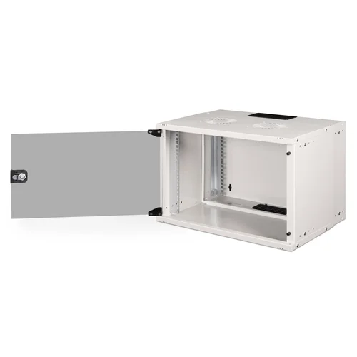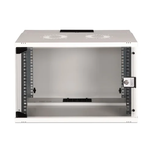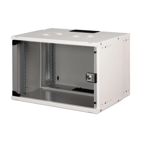 The DIGITUS® wall-mounted enclosure SOHO PRO series is characterized by its efficient delivery in an optimized flat pack and particularly user-friendly installation.- Compact housing for 483 mm (19") installations- Simplified logistics: delivered unassembled in an optimized flat pack- Quickly ready for use: Particularly user-friendly, quick installation with just a few screws- Flexible cable routing options thanks to protected openings in the roof and floor- Lockable safety glass door with 200° door opening angle- Depth-adjustable 483 mm (19") profile rails- Load capacity for the installation of components: 60 kgWhether in the home, office or for sub-distribution boards with limited space: With the compact 483 mm (19") solutions from the SOHO PRO series, you can install your network wherever you want. Available in four height units (4U, 7U, 9U, 12U), the wall-mounted enclosures are equipped with a full glass door and a cable entry in the top and bottom. Two pairs of galvanized 483 mm (19") profile rails, labelled with legible height units, are installed inside. These can be adjusted in depth. Each cabinet is a robust steel construction made of up to 1.5 mm thick sheet steel. The coloring takes the form of electrostatic powder coating in the standard colors grey (RAL 7035) and black (RAL 9005). The door hinges can be changed. The network enclosures are supplied unassembled in an optimized flat pack. Assembly takes place in just a few steps and is child's play thanks to the enclosed step-by-step instructions.