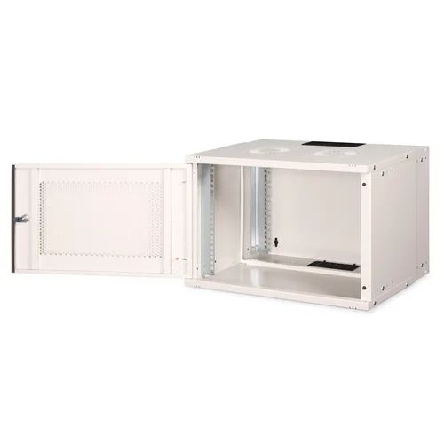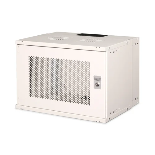 The DIGITUS® wall-mounted enclosure SOHO PRO series is characterized by its efficient delivery in an optimized flat pack and particularly user-friendly installation.- Compact housing for 483 mm (19") installations- Simplified logistics: delivered unassembled in an optimized flat pack- Quickly ready for use: Particularly user-friendly, quick installation with just a few screws- Flexible cable routing options thanks to protected openings in the roof and floor- Lockable steel front door with perforation, 200° door opening angle- Depth-adjustable 483 mm (19") profile rails- Load capacity for the installation of components: 60 kgWhether in the home, office or for sub-distribution boards with limited space: With the compact 483 mm (19") solutions from the SOHO PRO series, you can install your network wherever you want. The variant with a front door made of perforated sheet steel is available in three height units (7U, 9U, 12U). All cabinets are equipped with a cable entry in the top and bottom. Two pairs of galvanized 483 mm (19") profile rails labelled with legible height units are installed inside. These can be adjusted in depth. Each cabinet is a robust steel construction made of up to 1.5 mm thick sheet steel. The coloring takes the form of electrostatic powder coating in the standard colors grey (RAL 7035) and black (RAL 9005). The door hinges can be changed. The network enclosures are supplied unassembled in an optimized flat pack. Assembly takes place in just a few steps and is child's play thanks to the enclosed step-by-step instructions.